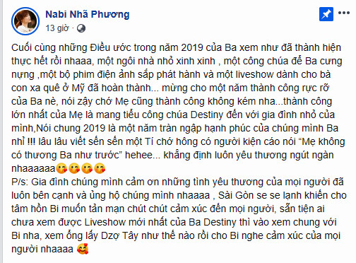 Cụ thể, nữ diễn viên viết: “Cuối cùng, những điều ước trong năm 2019 của ba xem như đã thực hiện được: Một ngôi nhà nhỏ xinh, một công chúa để ba cưng nựng, một bộ phim điện ảnh sắp phát hành và một live show cho bà con xa quê ở Mỹ đã hoàn thành. Thành công lớn nhất của mẹ là mang tiểu công chúa Destiny nhỏ đến với gia đình mình.