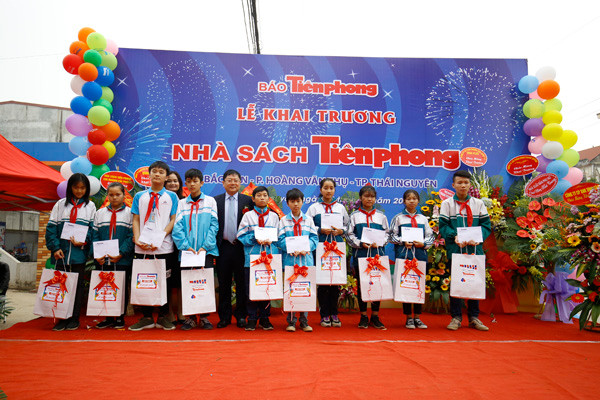 Trong lễ khai trương ngày 24/1, Nhà sách Tiền Phong Thái Nguyên trao 10 suất quà tặng cho các em học sinh nghèo vượt khó tiêu biểu của các trường THCS thành phố Thái Nguyên