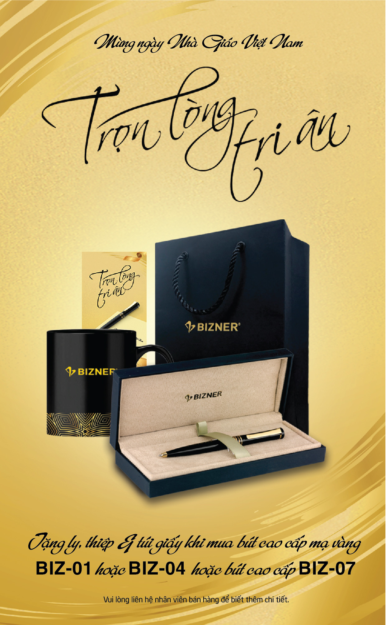 - Tặng thiệp, túi quà, 01 ly sứ cao cấp và 01 bút Bizner 168 cho đơn hàng bút Bizner có giá trị từ 60.000 đồng trở lên và các mã hàng bút Biz 01, 04, 07