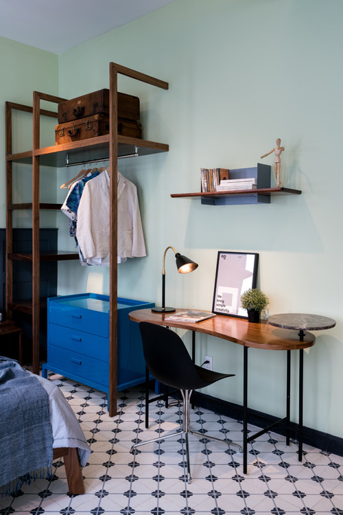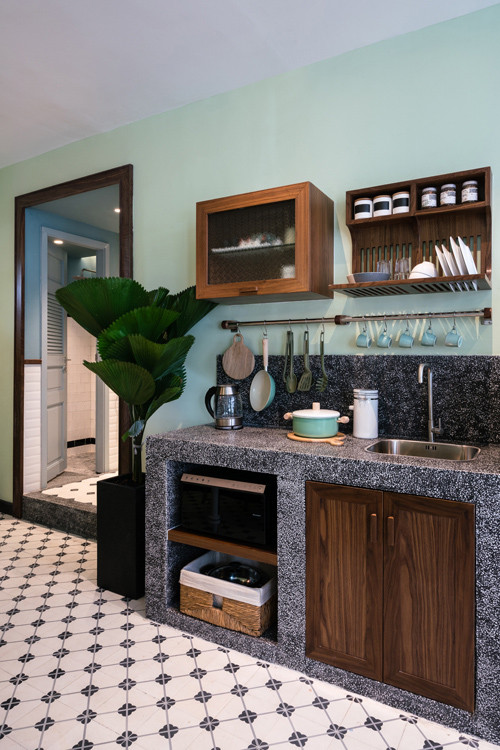 Ở đây có sự kết hợp giữa vật liệu gỗ óc chó màu ấm với tủ sơn mài màu xanh trẻ trung trên nền nhà gạch bông.