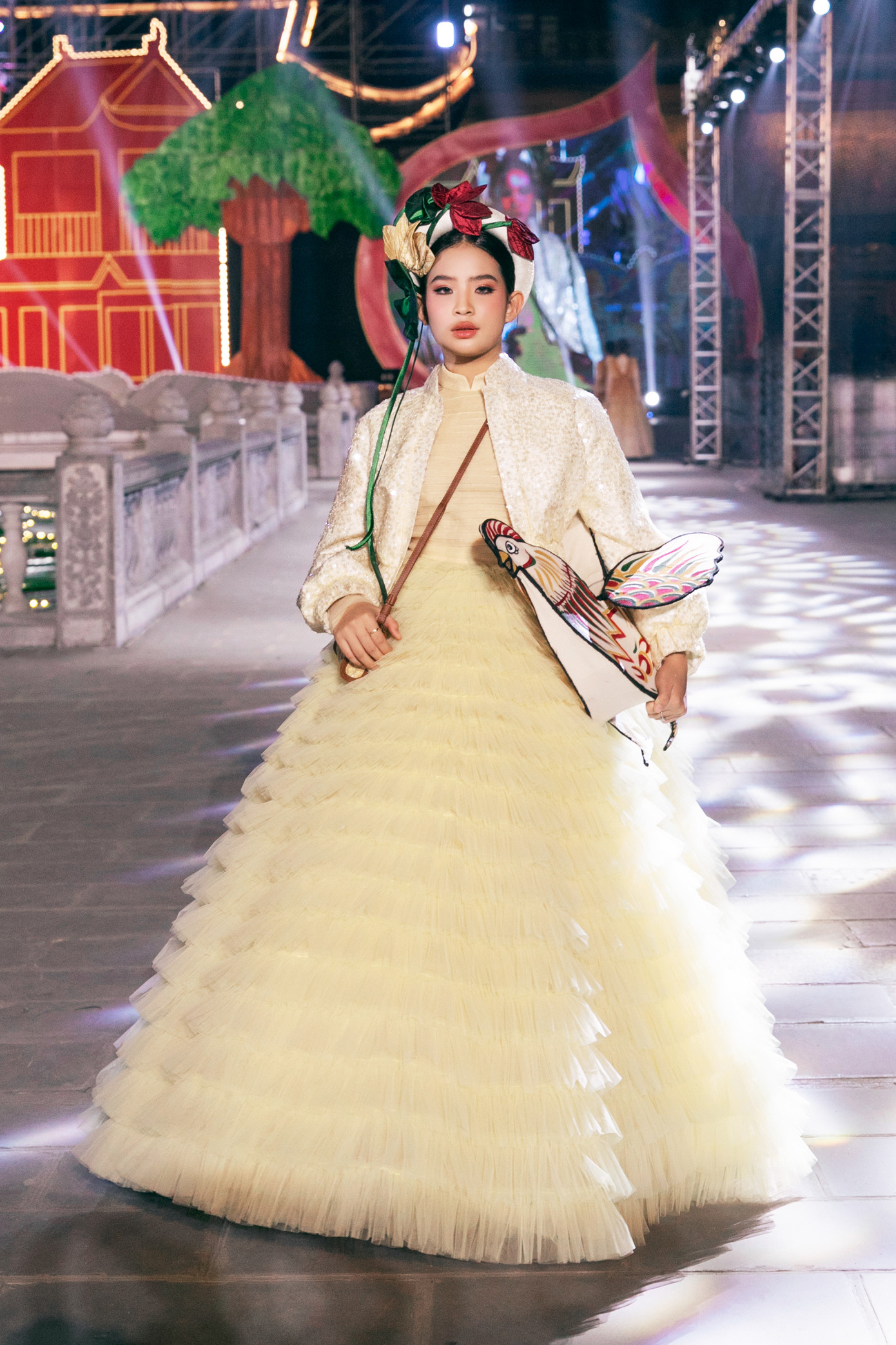 Xuyên suốt câu chuyện về văn hóa tranh Đông Hồ ở BST này, Nguyễn Minh Công đã mang đến hàng loạt mẫu thiết kế từ áo dài, áo yếm, áo ngũ thân với những họa tiết là các bức tranh Đông Hồ quen thuộc như Cá chép, Lợn âm dương, Tố nữ… Bức tranh Vinh quy bái Tổ - câu chuyện của quan trạng về làng được che lọng vàng được thể hiện bởi mẫu nhí Minh Vy.