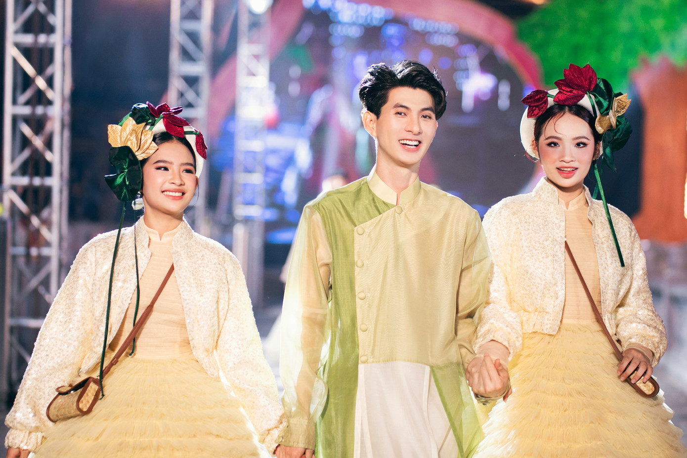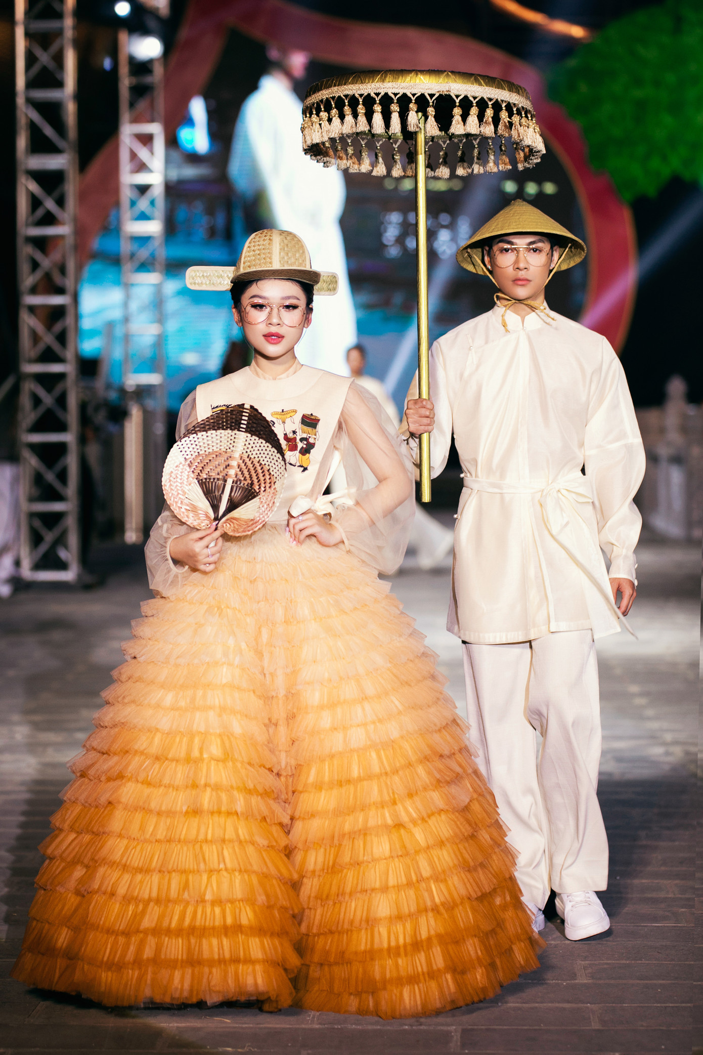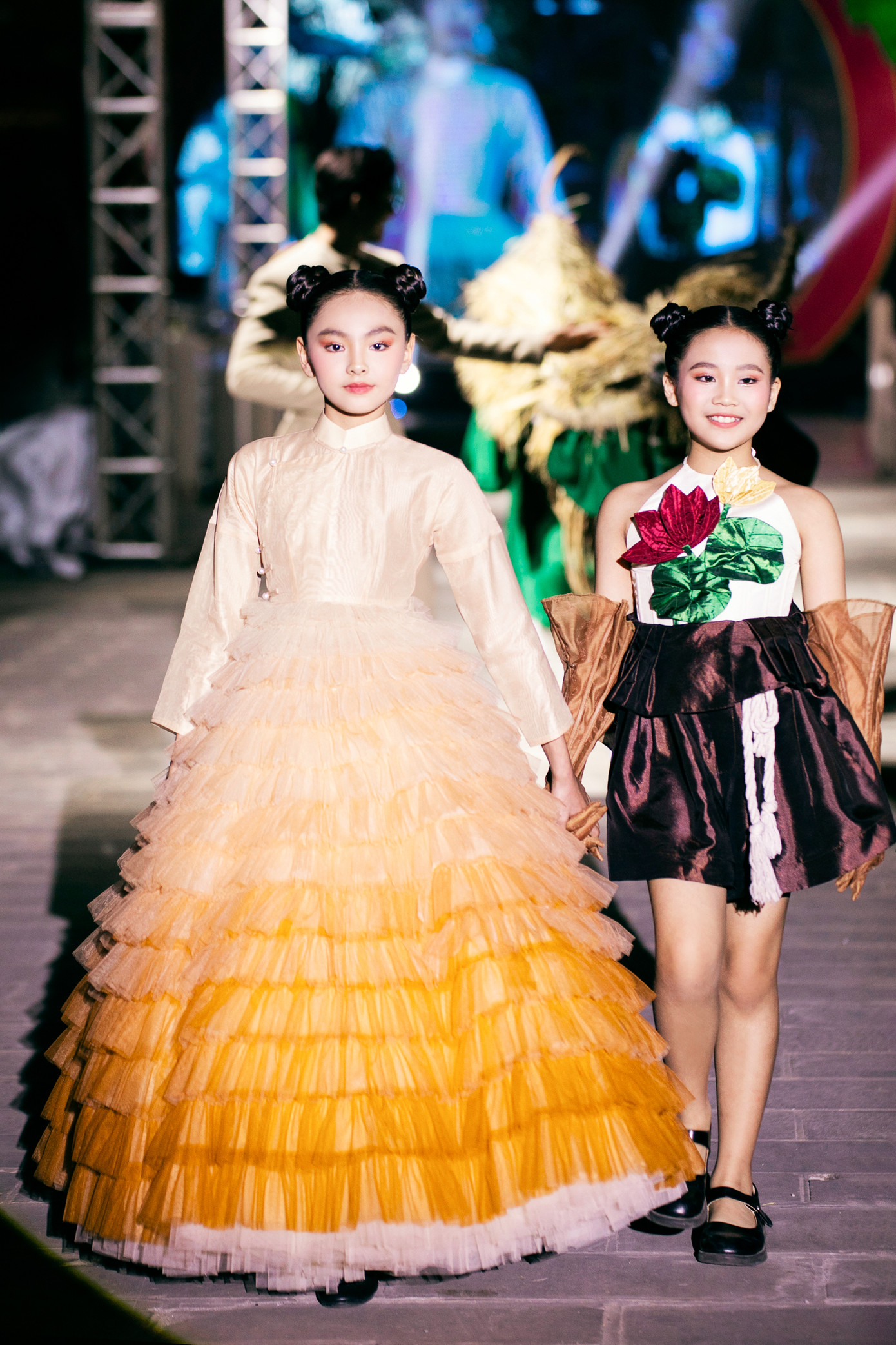 Bộ đôi vedette nhí Bảo Hà - Bảo Châu đã có màn trình diễn đầy ăn ý khi diện thiết kế là sự kết hợp áo khoác bomber hiện đại cùng chân váy bồng xòe với kỹ thuật in 3D hình ảnh Vinh hoa phú quý cùng mấn đầu được thêu kỳ công. Bảo Hà - Bảo Châu đã tái hiện hình ảnh hai em bé ôm gà, ôm vịt của bức tranh Vinh hoa phú quý tại show diễn bằng thời trang hiện đại với những bước catwalk chuyên nghiệp cùng thần thái kiêu sa.