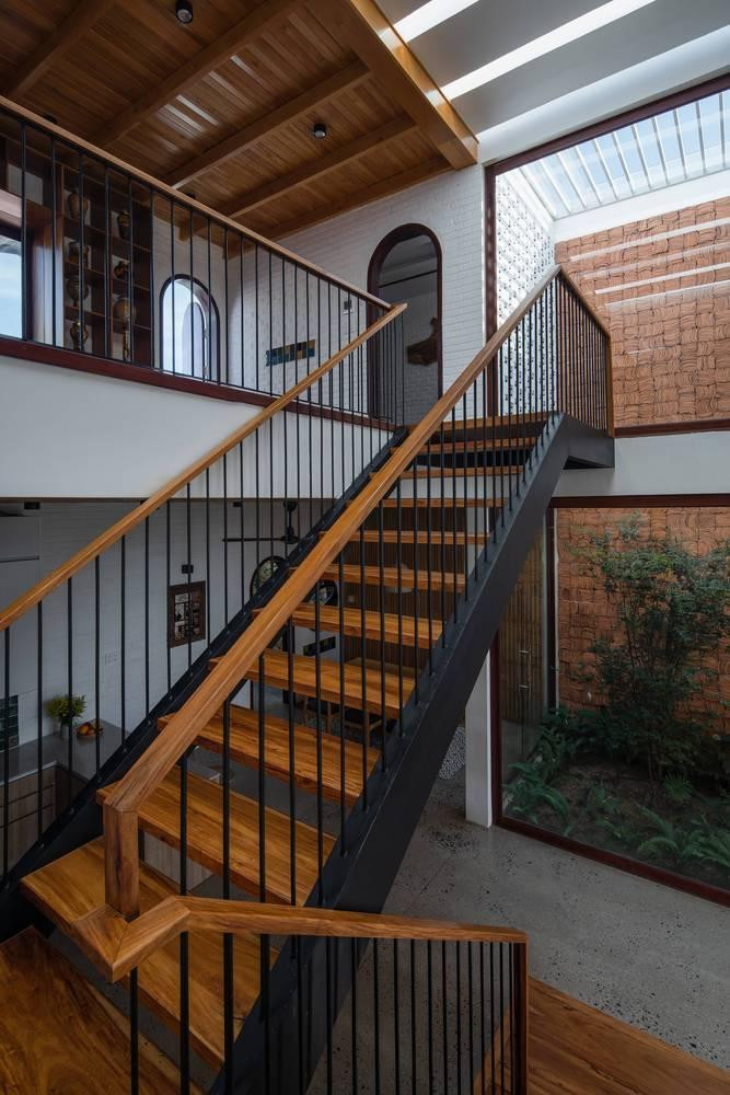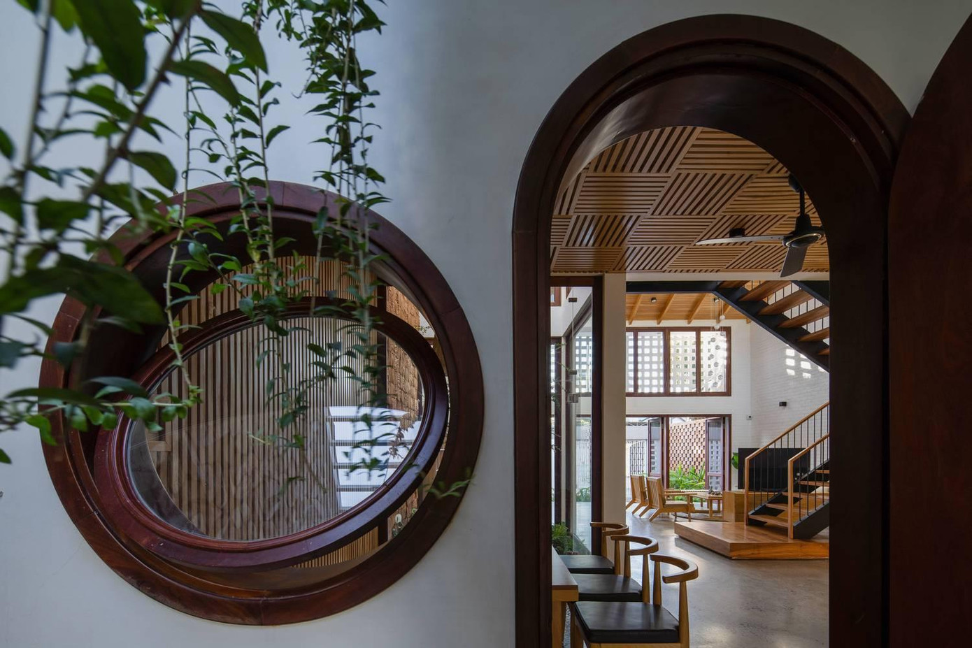 Hệ thống nan gỗ, gạch thông gió, giếng trời giúp các khối chức năng dễ dàng tiếp cận với thiên nhiên mà vẫn đảm bảo sự riêng tư cho từng không gian.