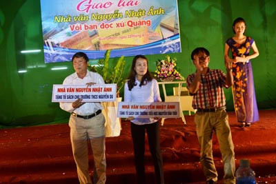 Nhà văn còn dành thời gian ký tặng sách, chụp hình lưu niệm cùng các bạn trẻ và em nhỏ mê thần tượng văn học của mình. Nhân dịp này, nhà văn Nguyễn Nhật Ánh cũng đã tặng 2 tủ sách cho các trường THCS Nguyễn Du và trường Tiểu học Nguyễn Văn Trỗi (Tam Kỳ).