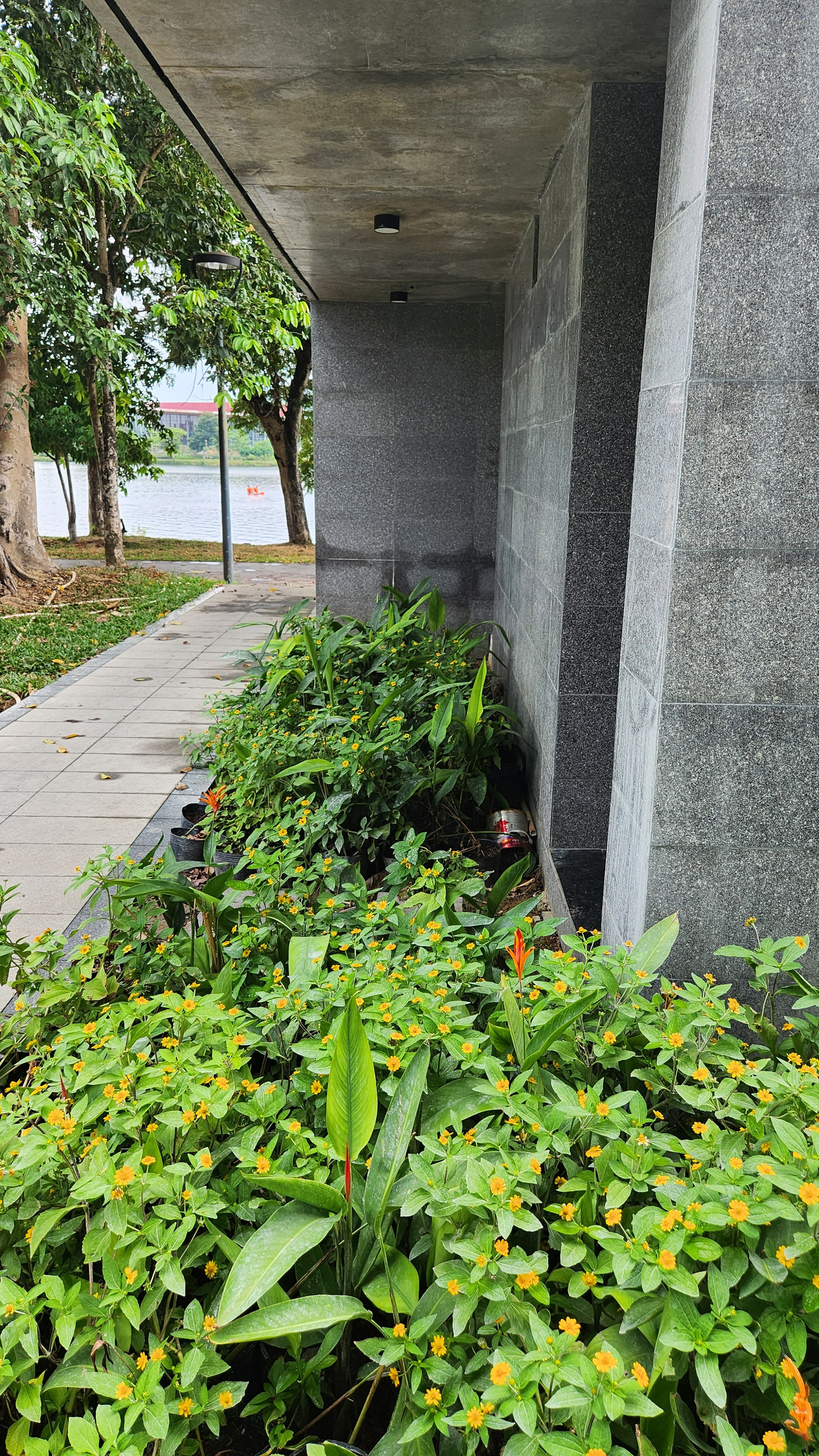 | Khoảng xanh hoa lá bắt mắt phía trước khu nhà vệ sinh trong công viên Bến Me ven sông Hương. |