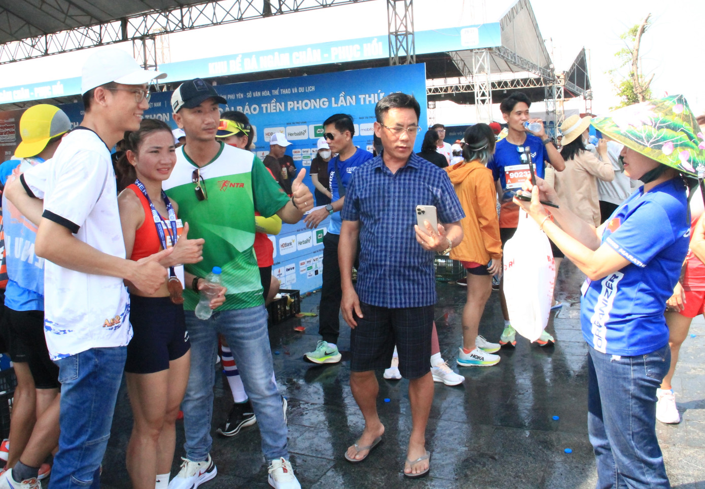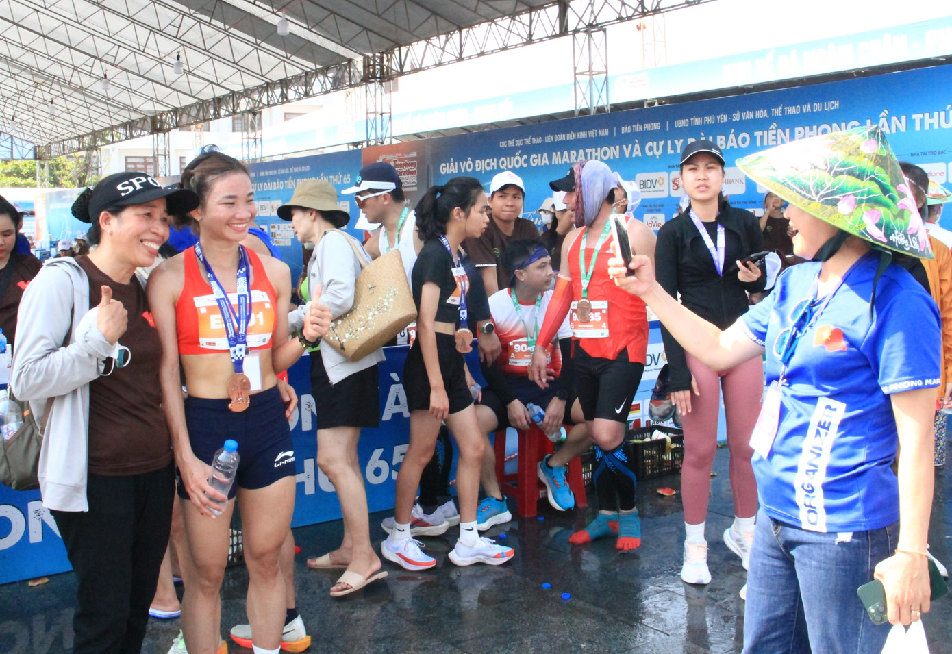 Ngay khi phát hiện VĐV Nguyễn Thị Oanh tại khu vực tiếp nước, người dân Phú Yên đã ùa đến xin chụp hình, động viên và thăm hỏi nồng nhiệt. Mặc dù rất mệt khi mới chạy xong, nhưng Oanh vẫn tươi cười chụp ảnh cùng người dân Phú Yên.