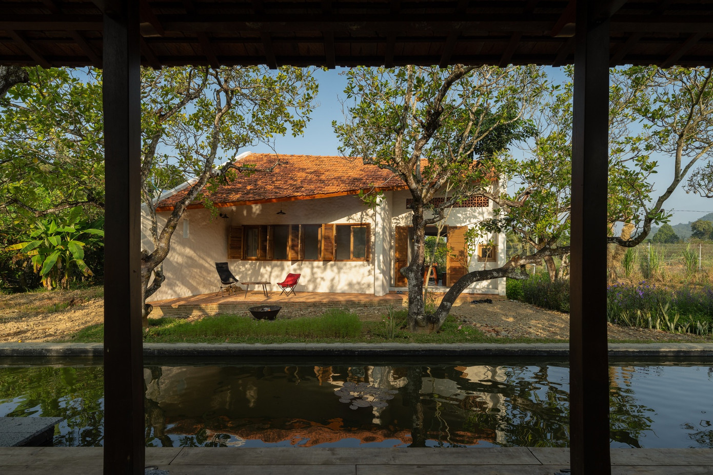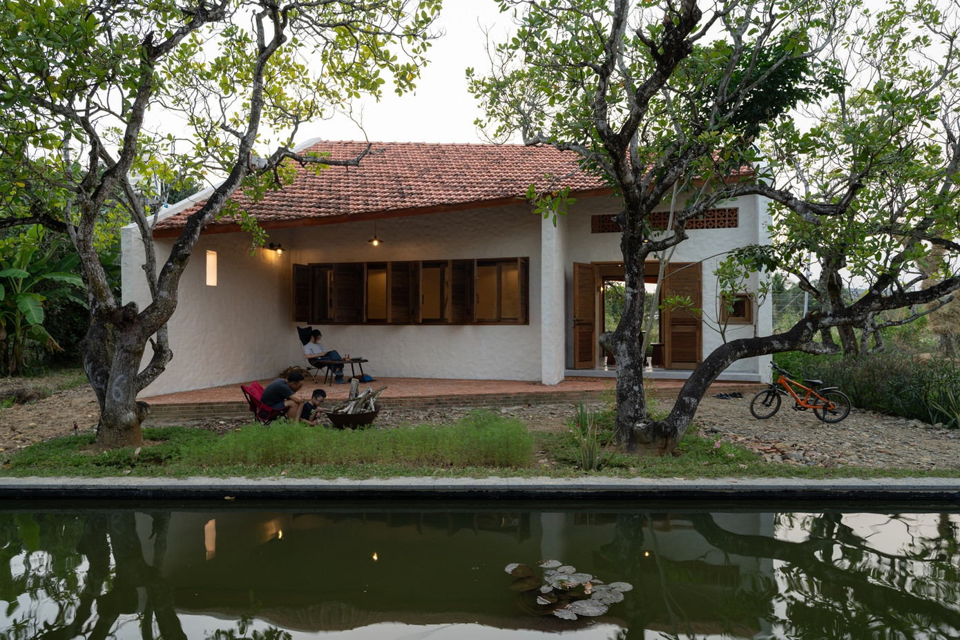 Sau nhiều phương án, ngôi nhà được chia thành 2 phần liên kết với nhau thông qua một hồ nước rộng. Bao gồm một bên là khu bếp + phòng ngủ, bên kia là khu vực chỗ ngồi có mái che.