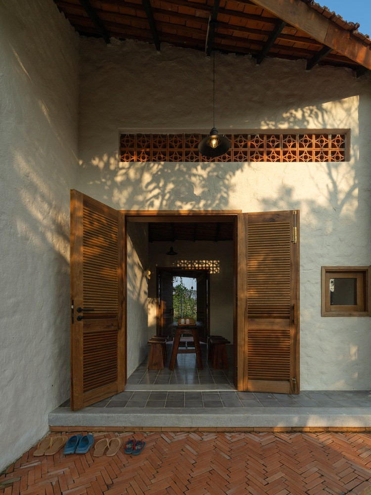 Phần bếp và khu vực ăn uống được cải tạo từ khung sẵn có để giảm sử dụng vật liệu. Vật liệu địa phương tái sử dụng được sử dụng trong toàn bộ dự án: gỗ tái chế, ngói đất sét cũ, thạch cao chưa hoàn thiện và đá tự nhiên.