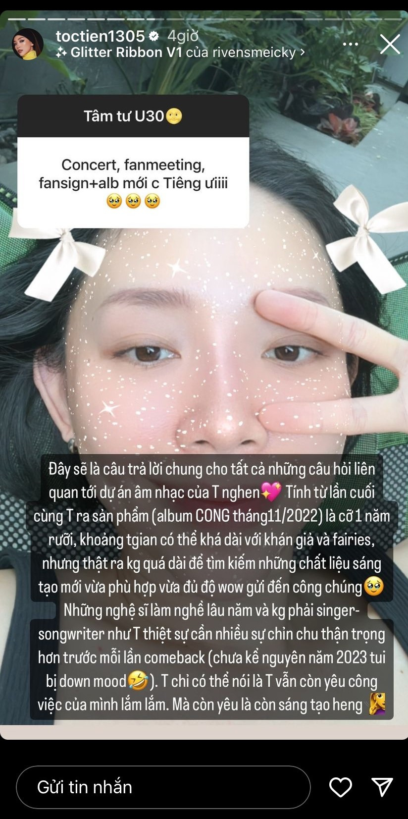 Mở diễn đàn tâm sự U30, Tóc Tiên nhận về nhiều câu hỏi quan tâm từ người hâm mộ. Đặc biệt, khi được hỏi về concert, fan meeting hay album mới, giọng ca Có Ai Thương Em Như Anh đã có những chia sẻ về việc ra mắt các dự án mới.