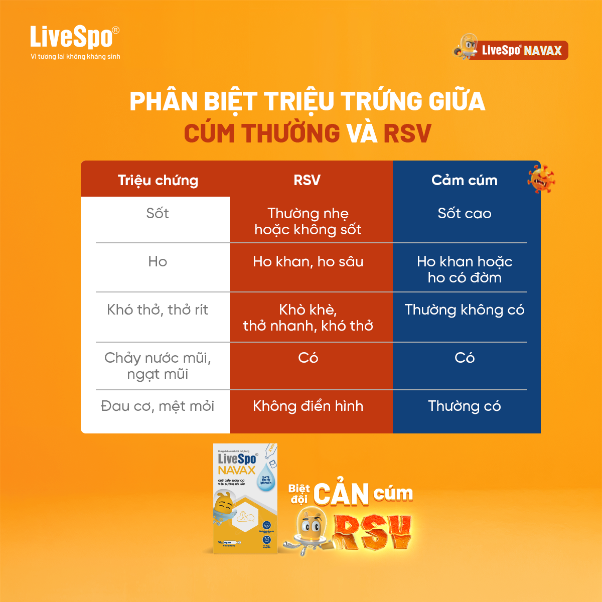 Trong bối cảnh các bệnh lý đường hô hấp ngày càng gia tăng do thời tiết thất thường, ô nhiễm môi trường, dịch bệnh..., và việc lạm dụng kháng sinh đang trở thành mối lo ngại lớn dẫn đến những hệ lụy nghiêm trọng như kháng kháng sinh. LiveSpo NAVAX - Bào tử lợi khuẩn giúp phòng ngừa và hỗ trợ điều trị RSV và cúm cho trẻ từ 0 - 2 tuổiđược coi là giải pháp đột phá, mở ra hướng đi mới trong phòng ngừa viêm đường hô hấp ở trẻ em trong cộng đồng với tính an toàn và hiệu quả cao.