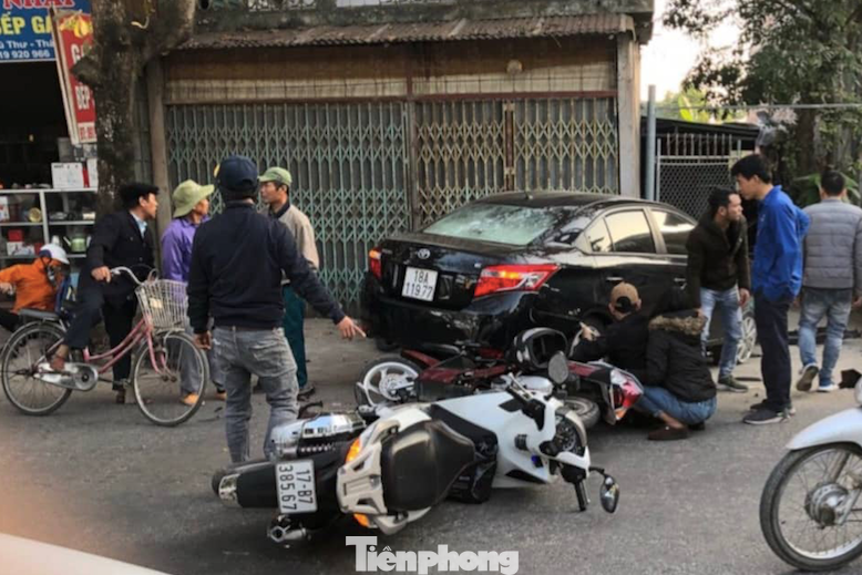 Cú tông liên hoàn khá mạnh khiến đầu ô tô bẹp dúm, 3 chiếc xe máy đều hư hỏng rất nặng. Tai nạn là 2 người ngồi trên xe gắn máy bị thương được đưa đi bệnh viện cấp cứu.