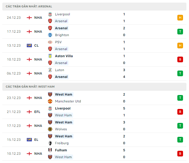 Theo thống kê, Arsenal đã thắng West Ham 8 trận liên tiếp trên Emirates ở Ngoại hạng Anh. Lần gần nhất họ thua đối thủ cùng thành phố này đã diễn ra từ năm 2015. Tính xa hơn, Arsenal chỉ thua West Ham 2 trận trên sân nhà trong 30 trận gần nhất trên mọi đấu trường (thắng 22, hòa 6).
