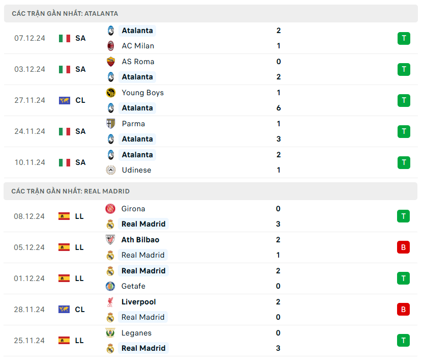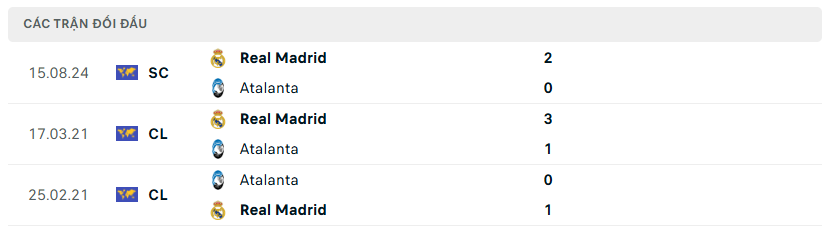 Lịch sử đối đầu, phong độ Atalanta vs Real Madrid