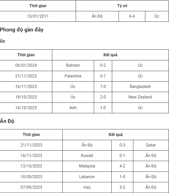 Trong trận đấu chiều nay, Australia sẽ có cho mình gần như là đội hình mạnh nhất với nhiều cầu thủ đang thi đấu tại châu Âu. Trong khi đó, Ấn Độ sở hữu các cầu thủ chỉ thi đấu tại giải quốc nội và đặt trọn niềm tin vào tiền đạo số 1 của họ là Sunil Chhetri trên hàng công. Theo thống kê, cả hai đội mới chỉ gặp nhau 1 lần vào năm 2011. Đó cũng là một trận đấu thuộc khuôn khổ Asian Cup. Trong trận đấu đó, Australia đã giành chiến thắng đậm 4-0 trước Ấn Độ.