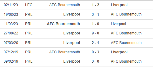 Theo thống kê, Liverpool sở hữu thành tích đối đầu vượt trội trước Bournemouth. Cụ thể, cả hai đội đã chạm trán tổng cộng 17 lần trong quá khứ và Liverpool giành chiến thắng đến 14 lần. Lần gần nhất hai đội gặp nhau là tại đấu trường Cúp Liên đoàn. Trong trận đấu này, Liverpool giành chiến thắng sát nút 2-1 trước đối thủ khi phải thi đấu trên sân khách.