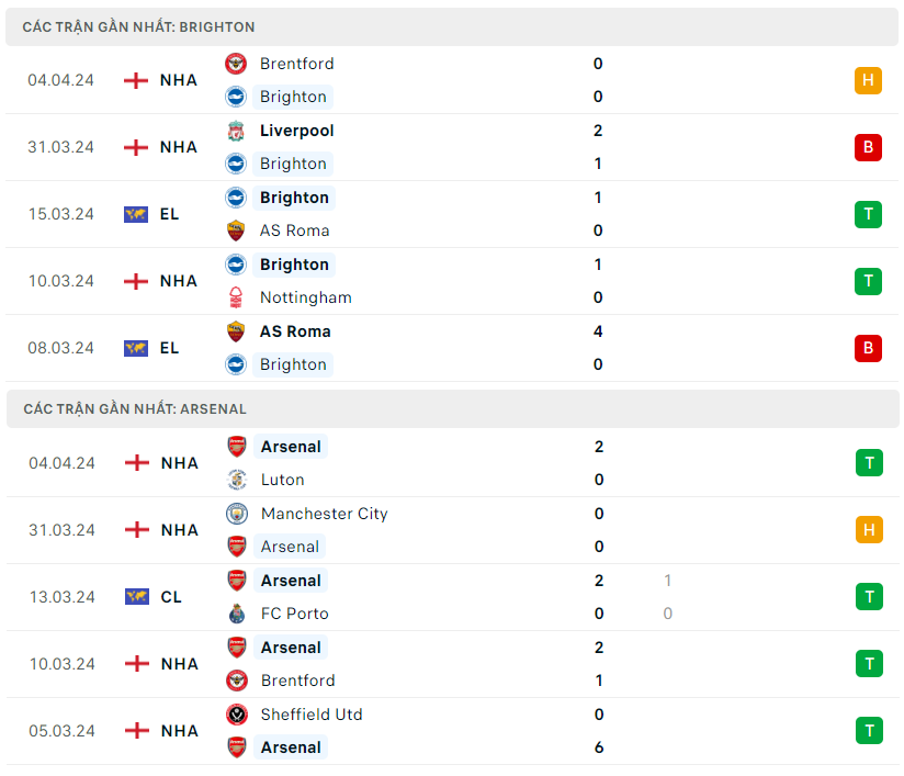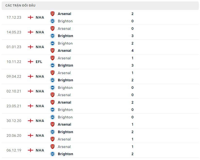 Lịch sử đối đầu, phong độ Brighton vs Arsenal
