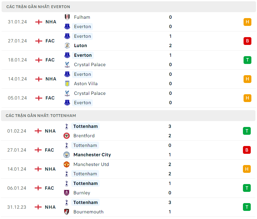 Lịch sử đối đầu, phong độ Everton vs Tottenham
