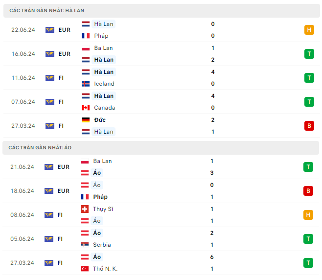 Giành chiến thắng trong trận đấu tối nay dường như là nhiệm vụ bất khả thi với Áo, đội đã thua 7 trận liên tiếp trước Hà Lan, trong đó bao gồm trận thua 0-2 ở EURO 2020. Lần gần nhất Áo thắng Hà Lan đã diễn ra từ tháng 5/1990.