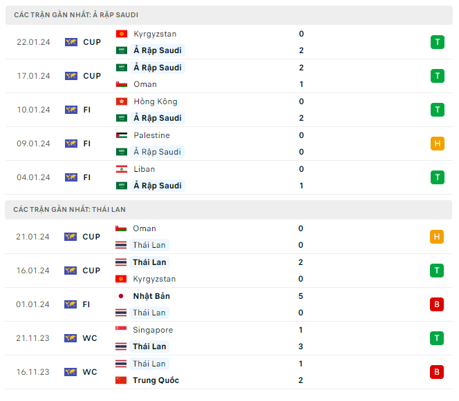 Phong độ, lịch sử 5 trận gần nhất của Saudi Arabia và Thái Lan