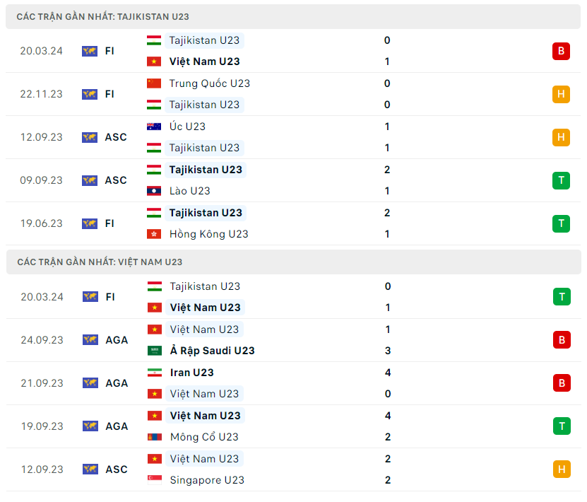Lịch sử đối đầu, phong độ U23 Tajikistan vs U23 Việt Nam