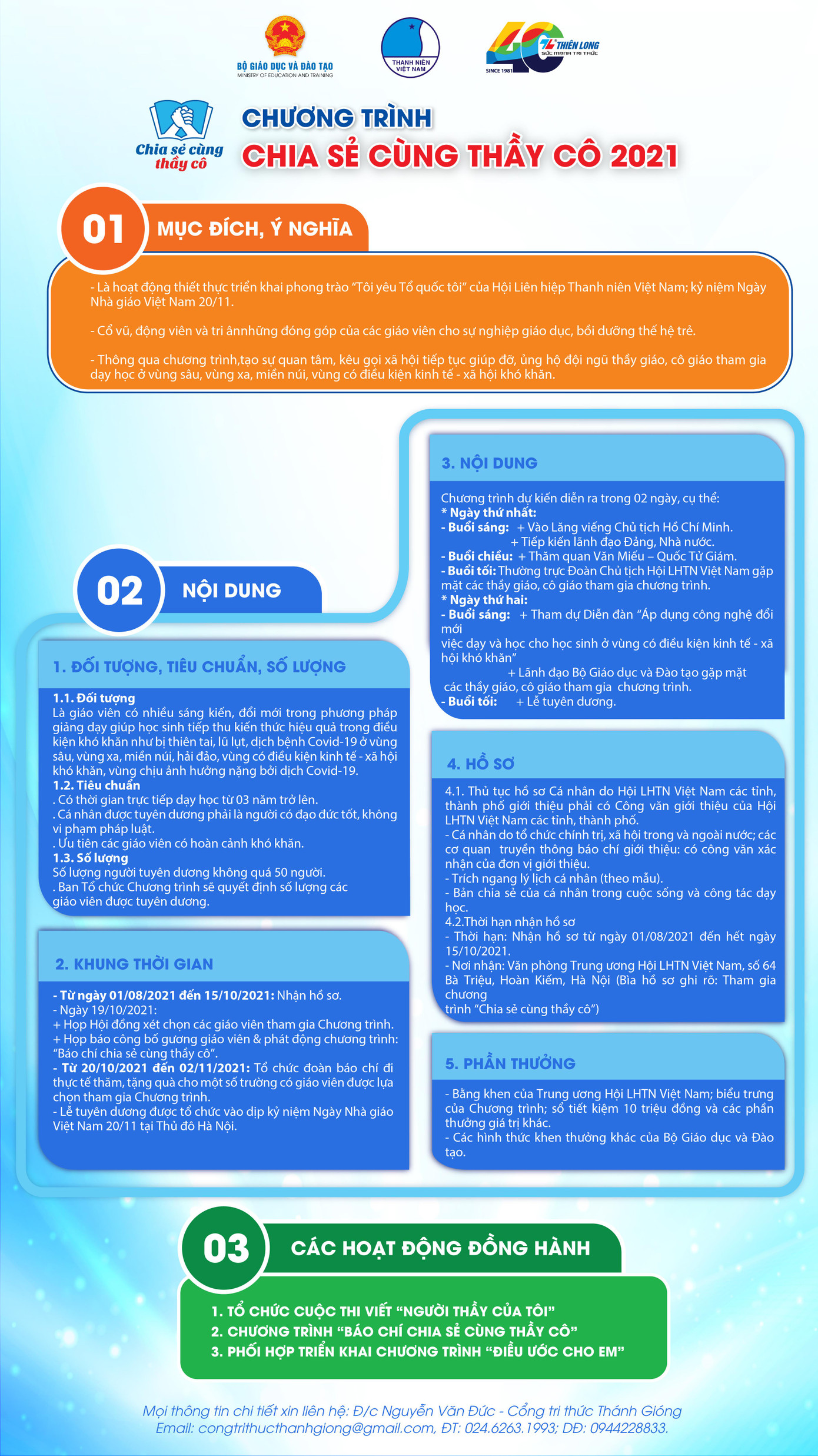 Triển khai phong trào “Tôi yêu Tổ quốc tôi” của Hội LHTN Việt Nam, hướng đến kỷ niệm Ngày Nhà giáo Việt Nam (20/11), T.Ư Hội LHTN Việt Nam phối hợp với Bộ GD&ĐT, Tập đoàn Thiên Long tổ chức chương trình “Chia sẻ cùng thầy cô” năm 2021.