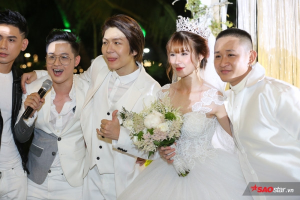 Đặc biệt trong khi cô dâu tung hoa, Kelvin Khánh nhanh tay lấy hoa cưới từ bà xã trao cho Kiều Minh Tuấn. Với sự ưu ái này, chú rể yêu cầu diễn viên Em chưa 18 phải hôn Cát Phượng. Không e ngại, anh dành cho bạn gái một nụ hôn ngọt ngào trong sự hò reo của mọi người.