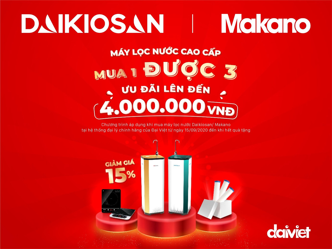 Và một trong những chương trình siêu sale khủng nhất năm là “Mua 1 được 3” được tổ chức bắt đầu từ ngày 15/9/2020. Theo đó, khi khách hàng mua máy lọc nước RO Daikiosan, Makano tại các đại lý tham gia chương trình khuyến mãi khắp toàn quốc sẽ được giảm giá 15%, tặng bếp từ hoặc bếp hồng ngoại cao cấp và bộ combo lõi lọc PP sử dụng 1 năm. Chương trình vẫn đang được diễn ra cho tới khi hết quà tặng.