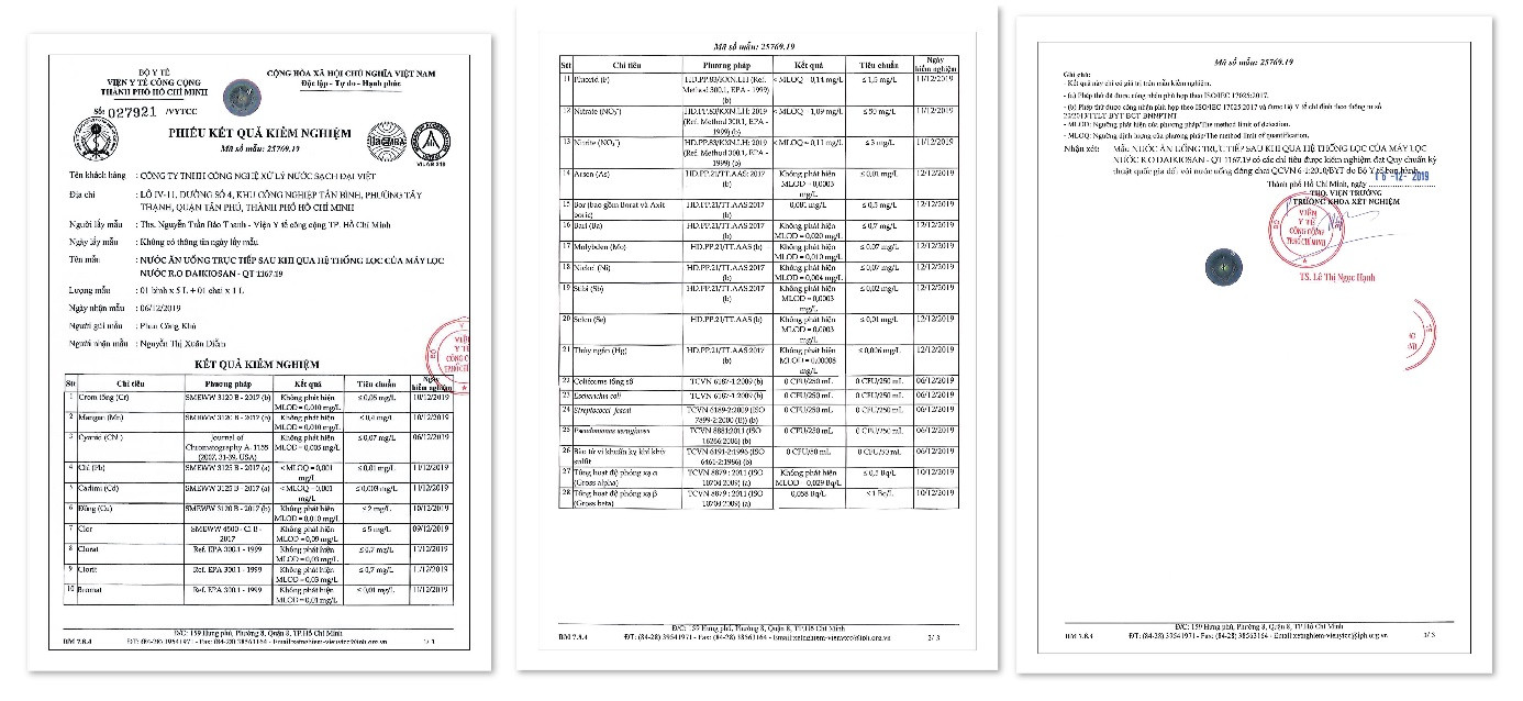 Được biết, toàn bộ các lô máy sản xất ra đều được Viện y tế Công cộng TP.HCM lấy ngẫu nhiên máy và kiểm định chất lượng đủ cả 2 Quy chuẩn của Bộ y tế: QCVN 01:2009/BYT: Quy chuẩn kỹ thuật quốc gia về chất lượng nước ăn uống và QCVN 6-1:2010/BYT: Quy chuẩn kỹ thuật quốc gia đối với nước uống đóng chai (uống trực tiếp).