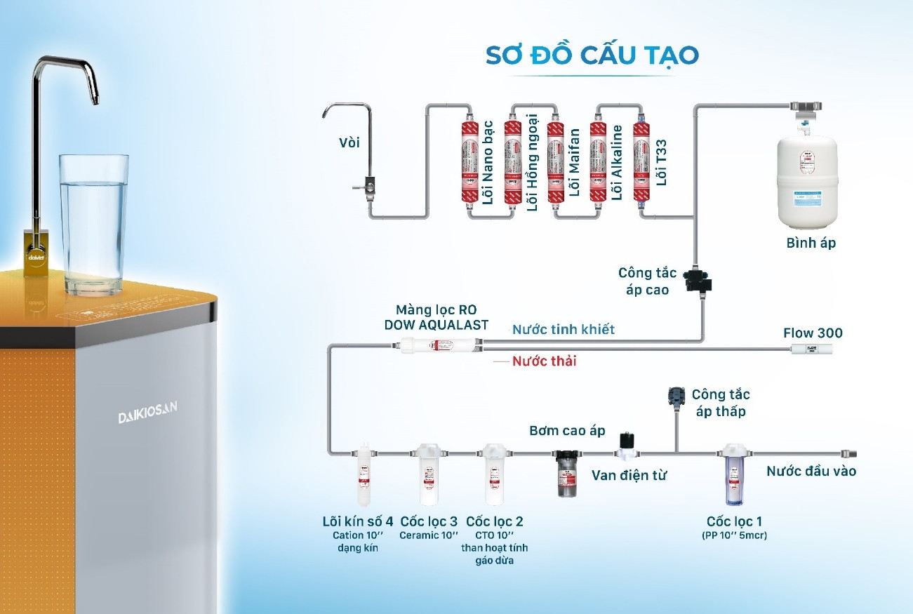 Máy lọc nước RO Daikiosan sử dụng hệ thống 4 lõi lọc thô, màng RO Aqualast nhập khẩu từ Mỹ sẽ phù hợp lọc sạch đa dạng nguồn nước ô nhiễm và loại bỏ tới 99,99 % chất độc hại, vi khuẩn có trong nước, đưa nước về trạng thái tinh khiết. Sau đó, mới tới các lõi nâng cấp bù khoáng tốt cho cơ thể. Vì vậy, máy sẽ lọc sạch được đa dạng nguồn nước ô nhiễm đặc thù từng khu vực như: nhiễm phèn, đá vôi, nhiễm mặn, hay nhiễm asen… có trong nước giếng, nước khoan, nước ngầm hay nước máy…