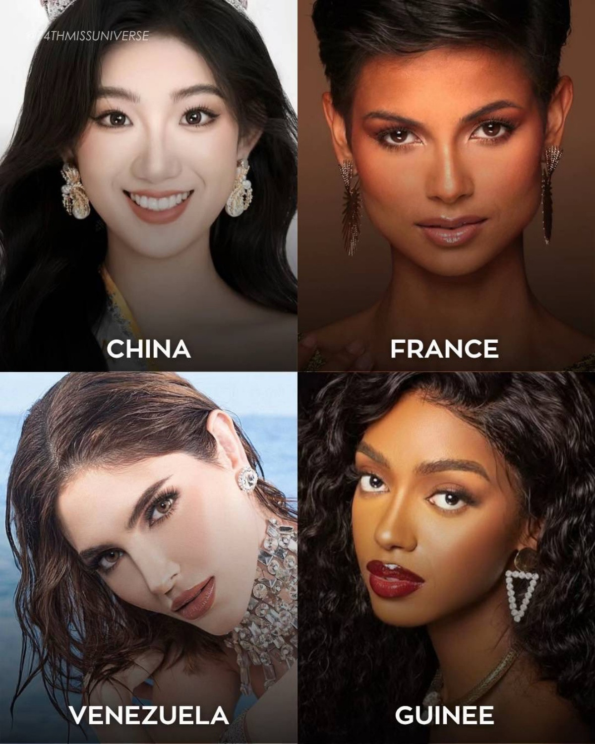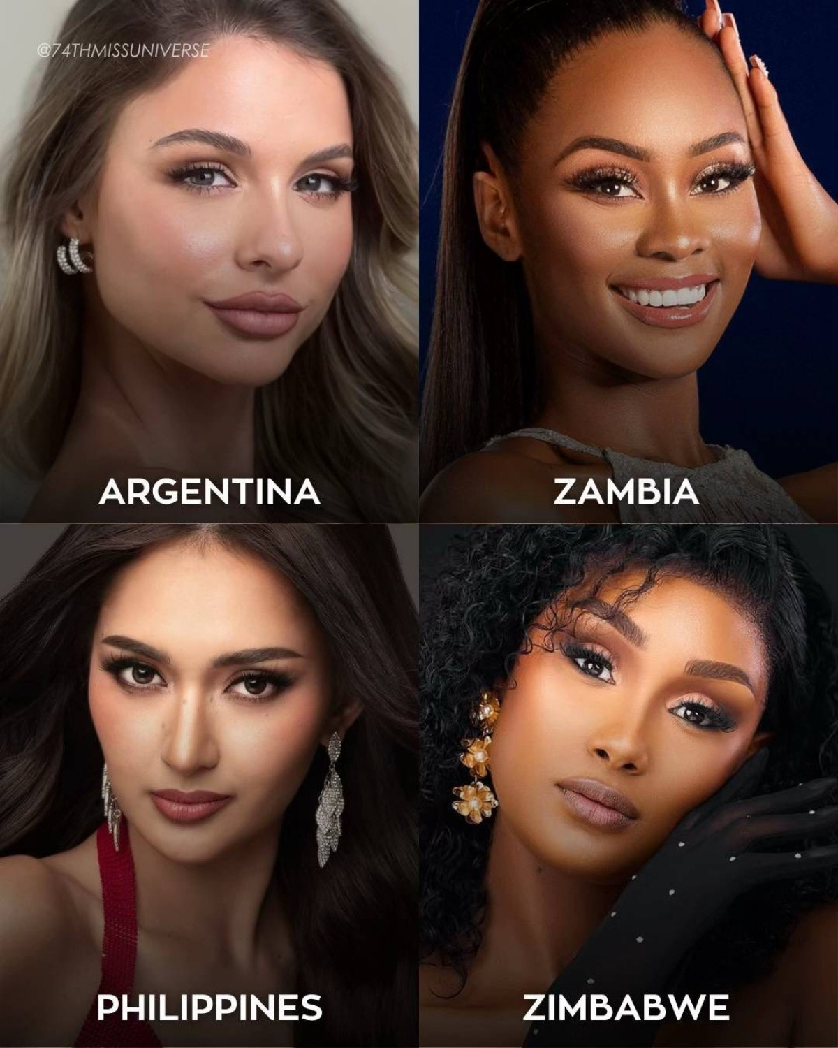 Từ trái qua phải, từ trên xuống dưới: Hoa hậu Argentina Aldana Masset - Hoa hậu Zambia Kunda Mwamulima - Hoa hậu Philippines Ahtisa Manalo - Hoa hậu Zimbabwe Lyshanda Moyas.