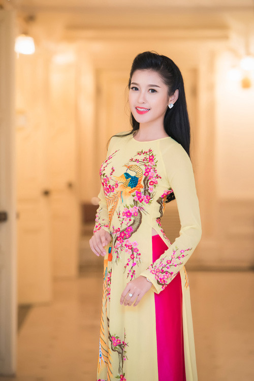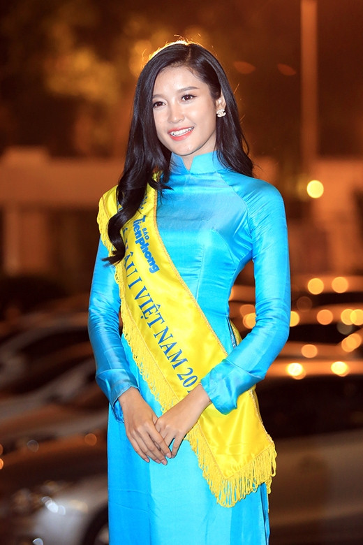 Huyền My chọn áo dài màu xanh giản dị mà không kém phần nổi bật khi tham dự một sự kiện về thanh niên. Cô vẫn giữ được nét trong sáng và hồn nhiên của tuối 19.