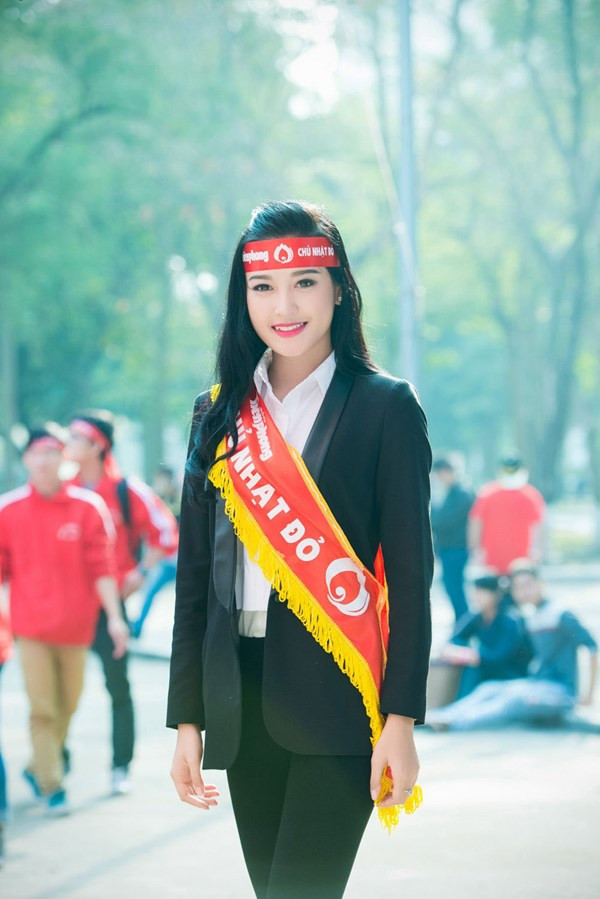 Á hậu lần đầu tham dự ngày hội hiến máu Chủ Nhật Đỏ do báo Tiền Phong tổ chức. Cô chọn áo trắng, quần đen thanh lịch nhưng vẫn vô cùng xinh đẹp.