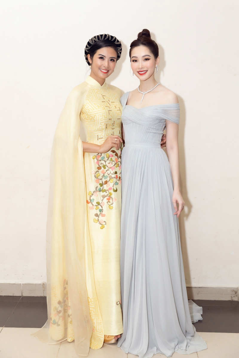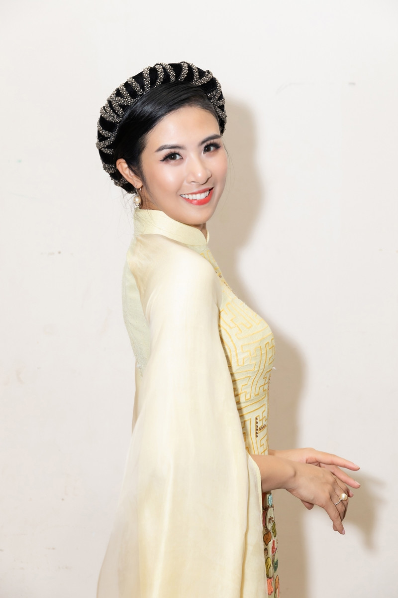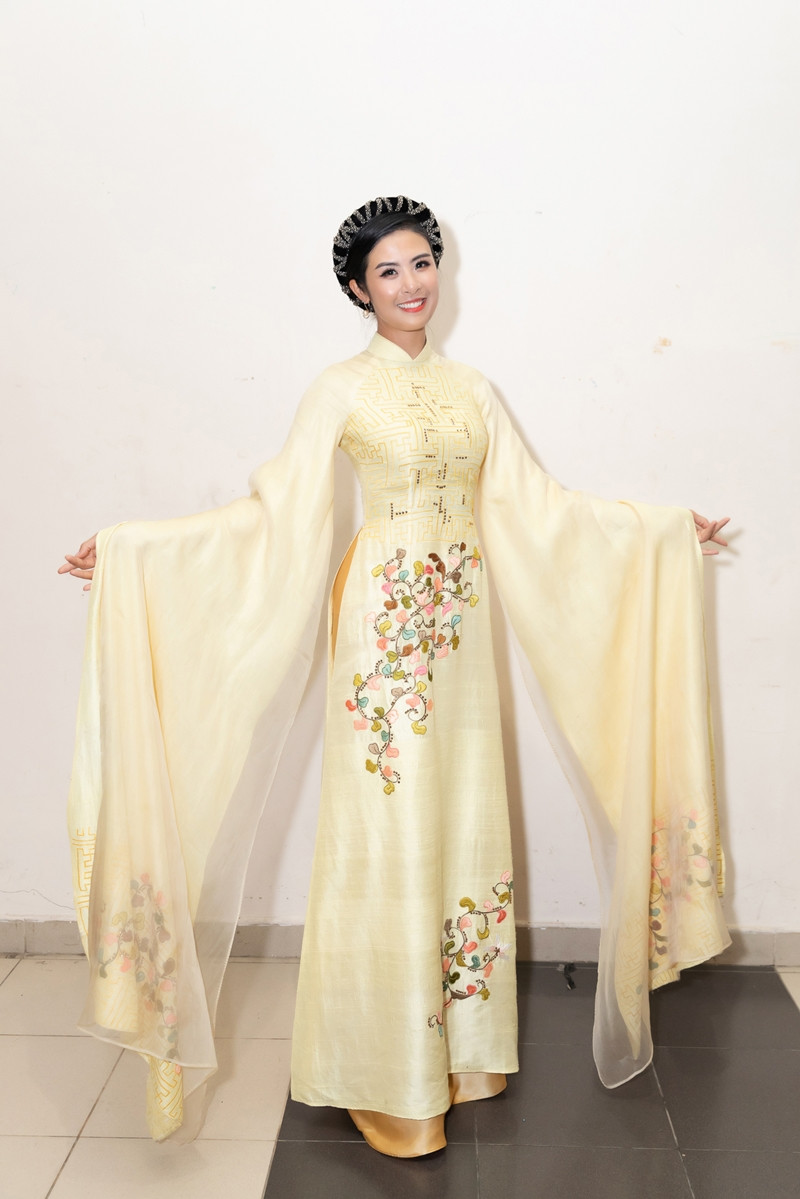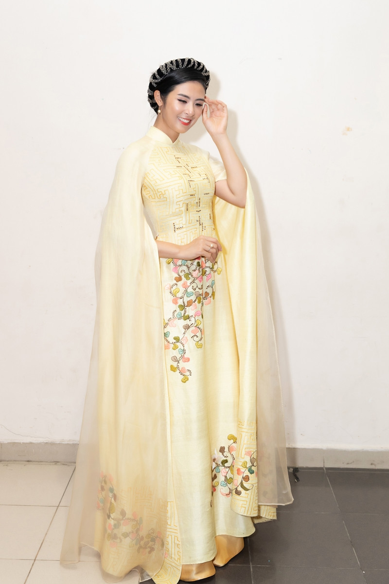 Là NTK áo dài có tiếng trong giới thời trang, Hoa Hậu Ngọc Hân xuất hiện trên thảm đỏ đêm chung kết Hoa Hậu Việt Nam với chiếc áo dài vàng trong BST áo dài Hoàng Hoa Liên do chính cô thiết kế.