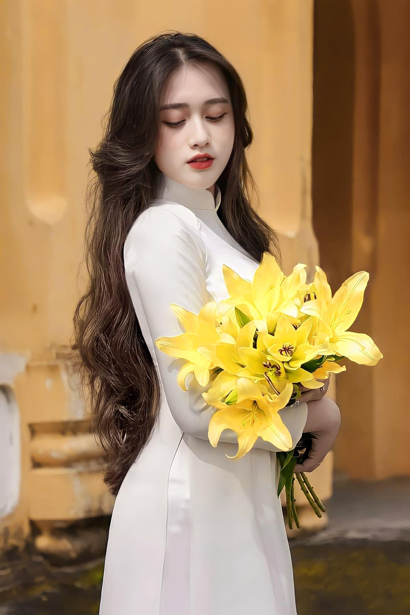 | Bộ ảnh “Tinh khôi” của Phương Yên được lấy cảm hứng từ áo dài trắng nữ sinh, cùng hoa ly và nắng vàng cuối thu mang nhiều cảm xúc. |