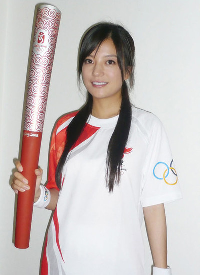 Triệu Vy để mặt mộc khi rước đuốc tại Thế vận hội Bắc Kinh 2008.