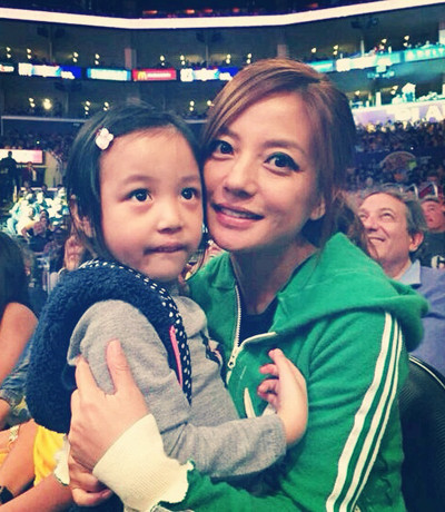 Nữ diễn viên đưa con gái đi xem thi đấu thể thao. Hai mẹ con nổi bật với đôi mắt to.