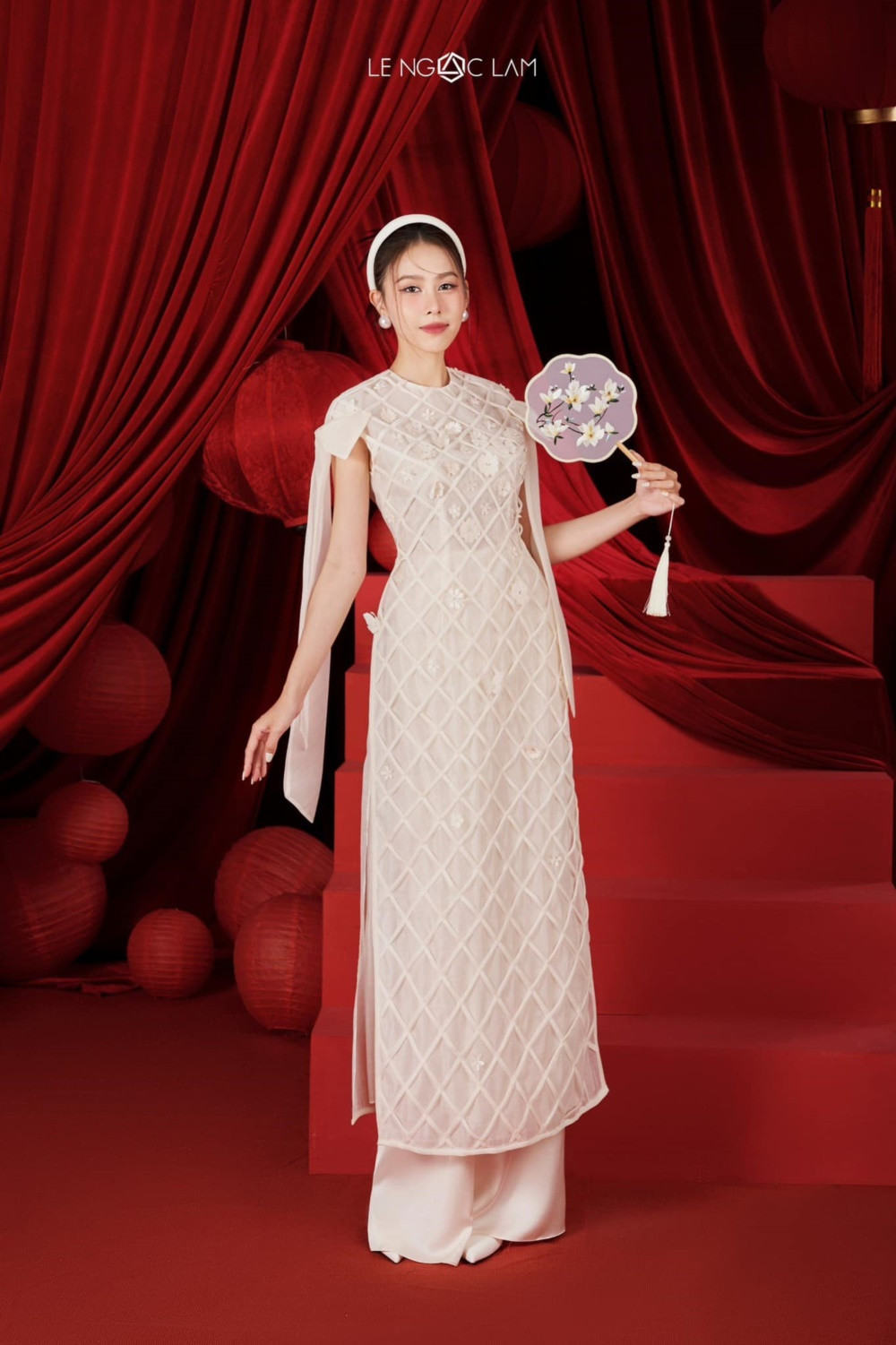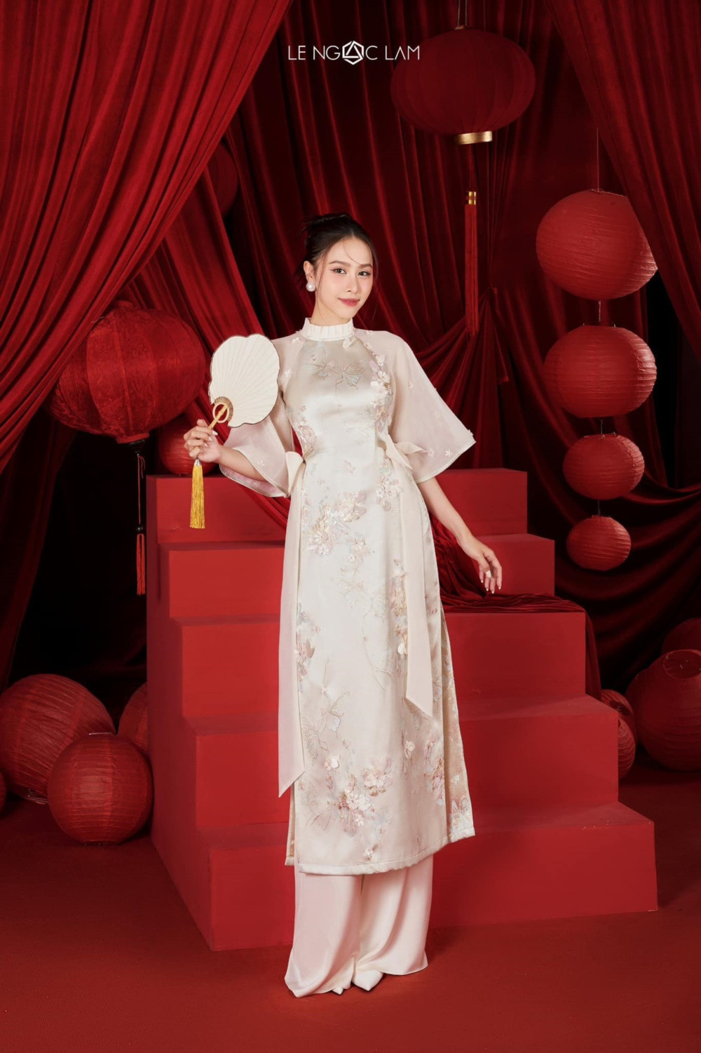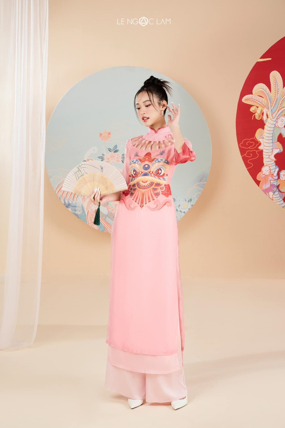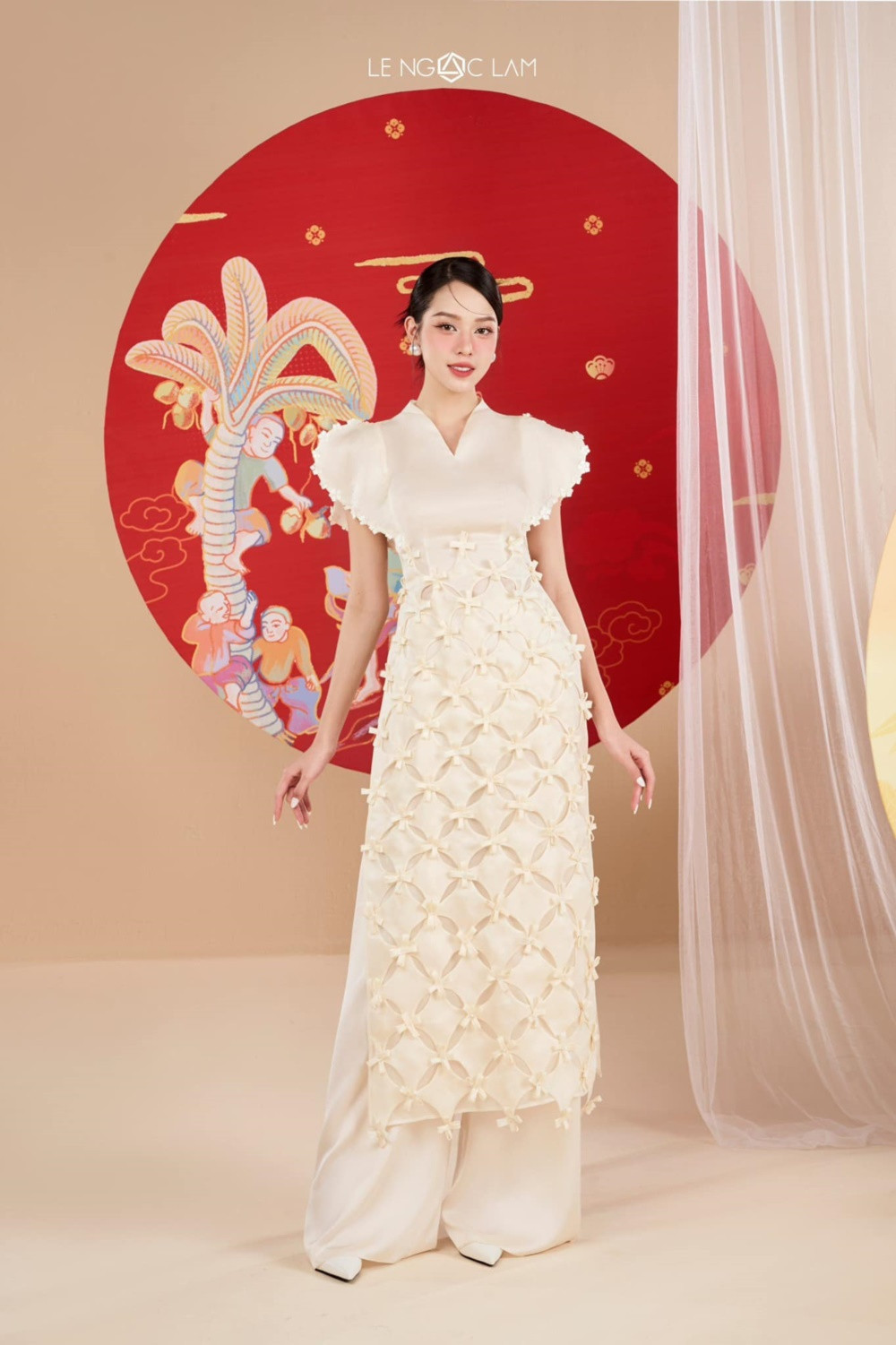 Bộ sưu tập áo dài có tên Dáng Xinh là sự kết hợp giữa truyền thống và hiện đại, kỹ thuật sắp xếp, đính kết 3D các chi tiết như hoa, bướm, đồng xu kết hợp cùng tranh Đông Hồ trên nền các chất liệu gấm, organza, taffeta, lụa.
