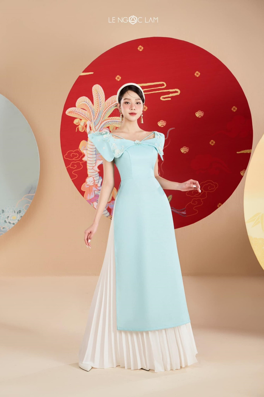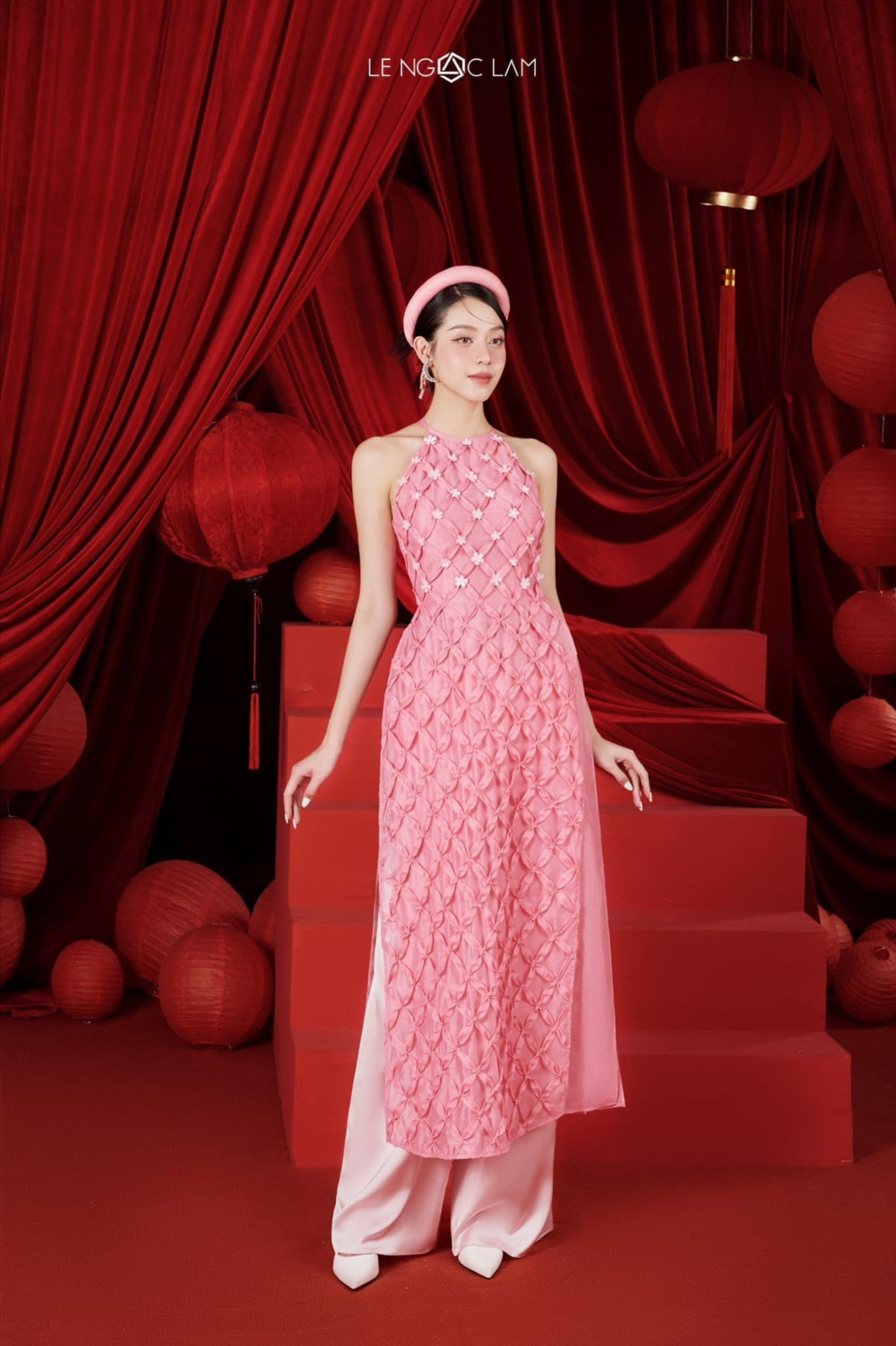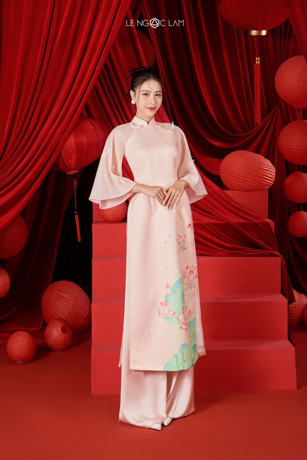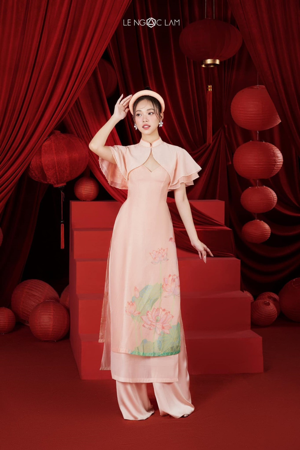 Bộ sưu tập áo dài có tên Dáng Xinh là sự kết hợp giữa truyền thống và hiện đại, kỹ thuật sắp xếp, đính kết 3D các chi tiết như hoa, bướm, đồng xu kết hợp cùng tranh Đông Hồ trên nền các chất liệu gấm, organza, taffeta, lụa.