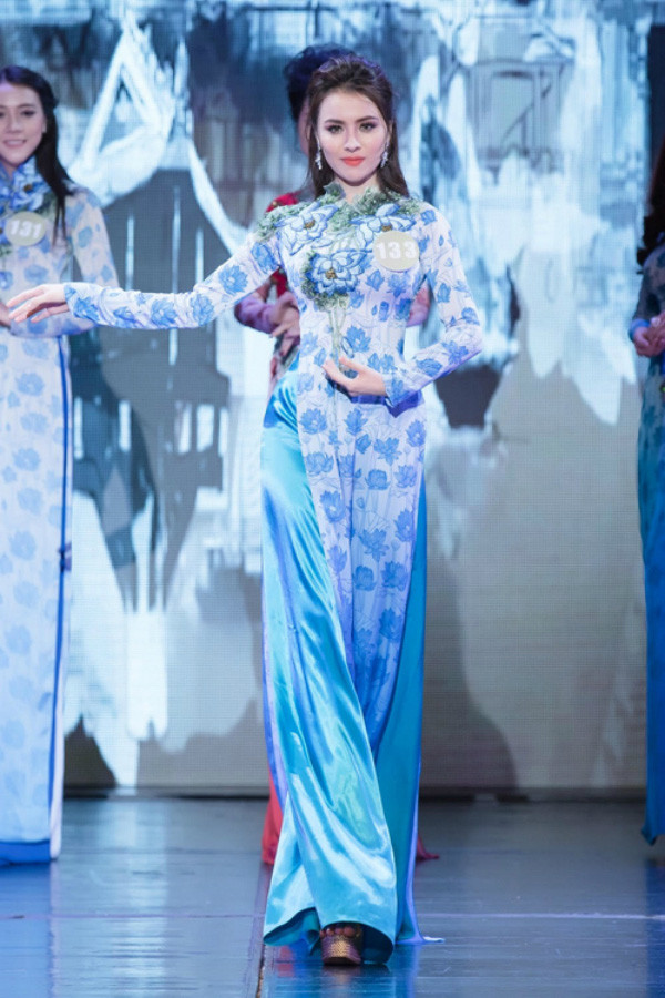 Thư Dung khoe nét đẹp dịu dàng và duyên dáng trong bộ áo dài họa tiết hoa màu xanh.