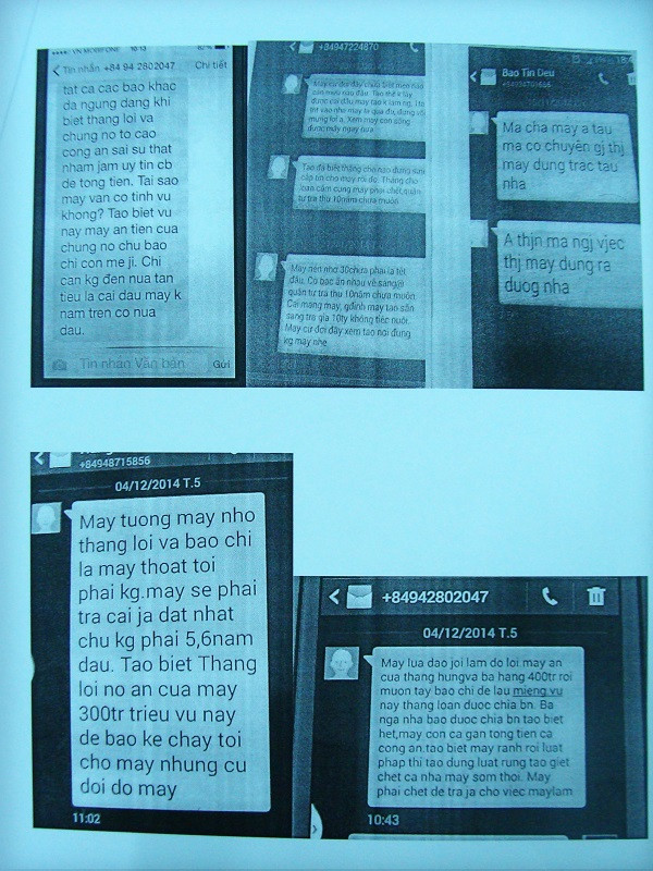 Cùng số sim 0942.802047 này trước đó đã nhắn vào điện thoại ông Trần Minh Lợi, người đứng tên công khai trong các đơn thư tố cáo sai phạm của thiếu tá Quang “…tao biet may ranh roi luat phap thi tao dung luat rung tao giet ca nha may som thoi. May phai chet de tra ja cho viec may lam”.