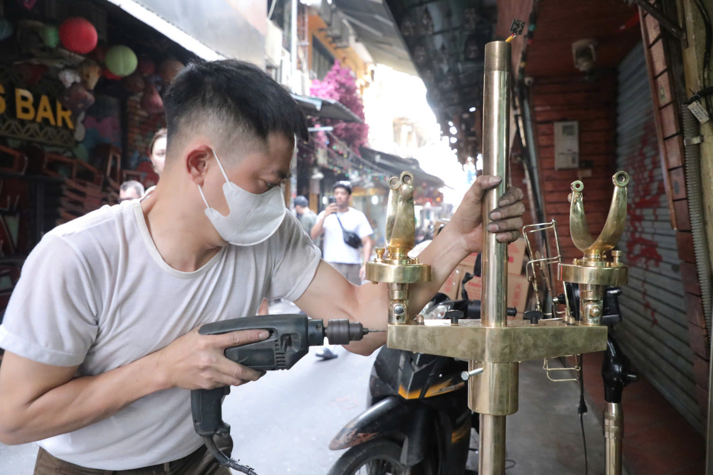 | Những người thợ hồi sinh quạt cổ tại cửa hàng của anh Đức |