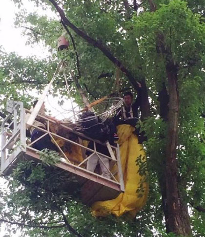 Phải nhờ sự giúp đỡ của các nhân viên cứu hộ, cậu mới có thể xuống đất an toàn.