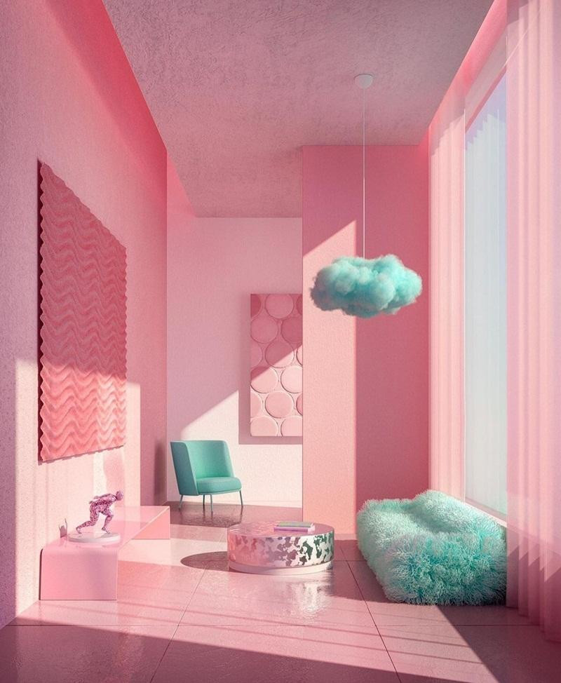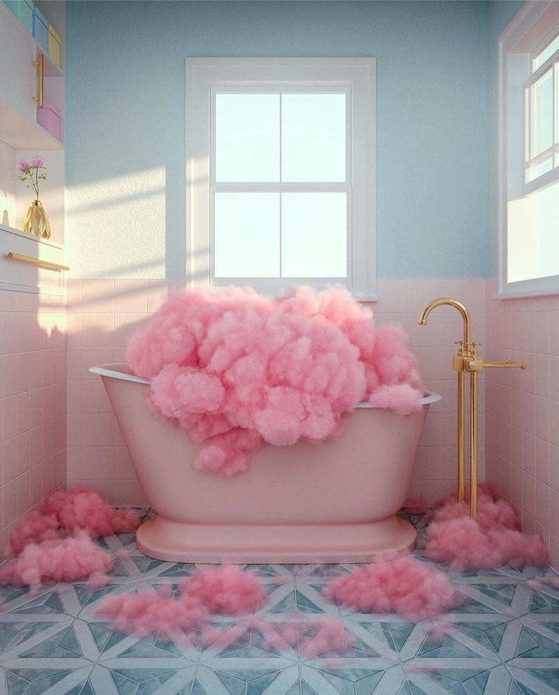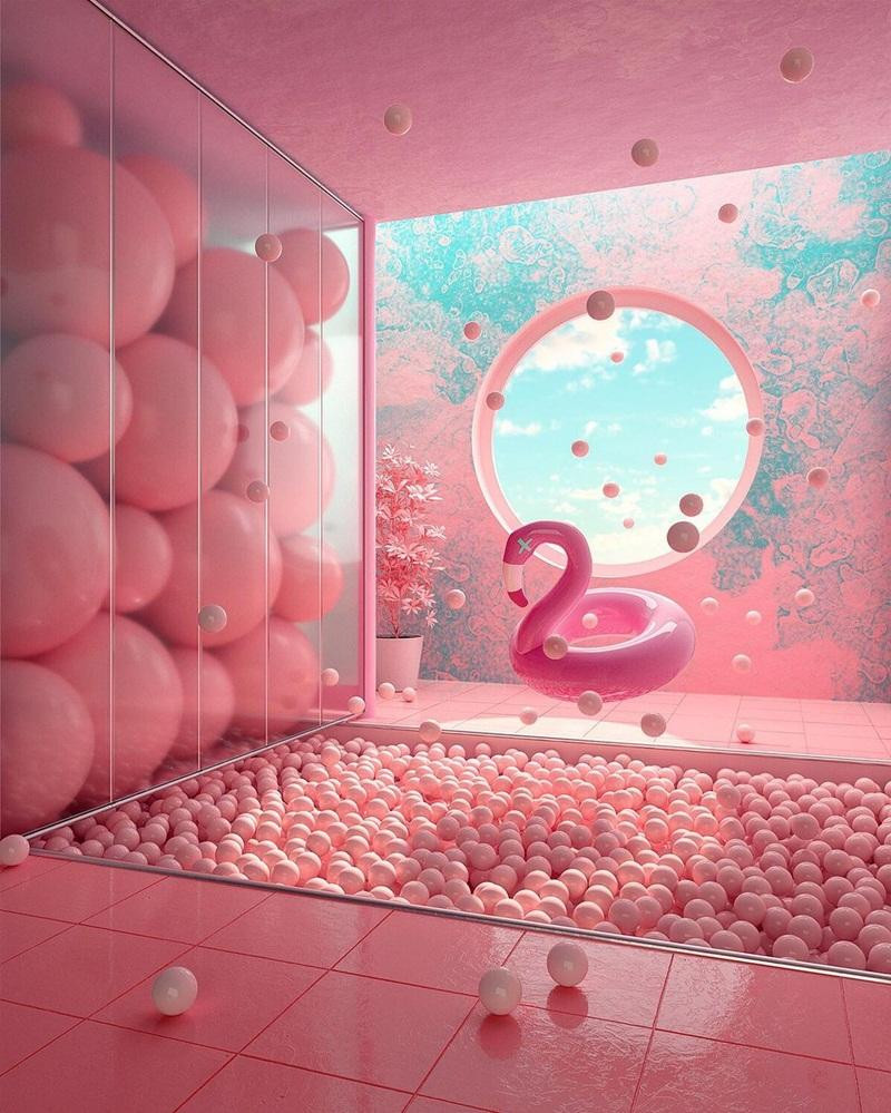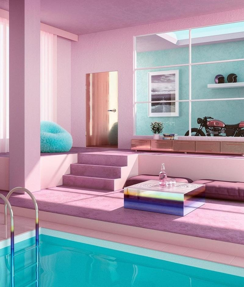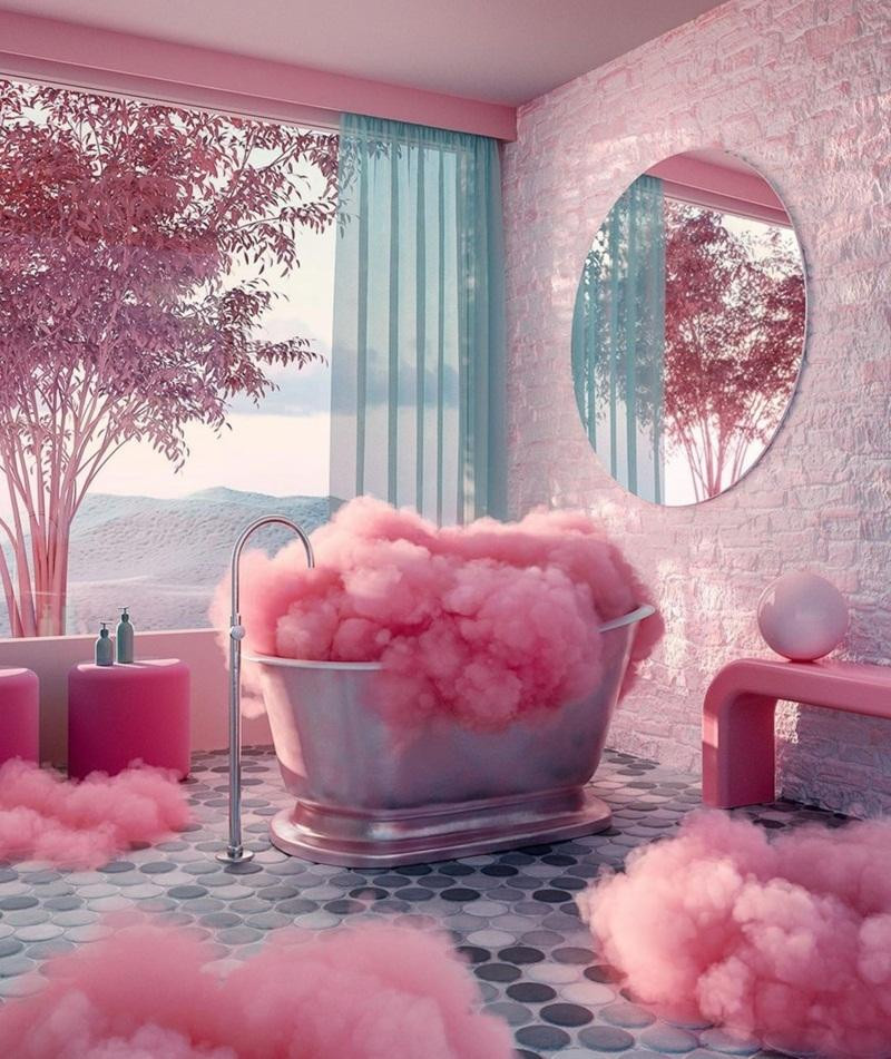 Ở đó, bạn dễ dàng bắt gặp những góc bày trí nội thất với tông màu hồng phấn bắt mắt, nhưng cũng thấy cả những điều phi thực tế như cây cối màu hồng, những cây nấm màu hồng, những đám mây đang cuộn lại trong bồn tắm...