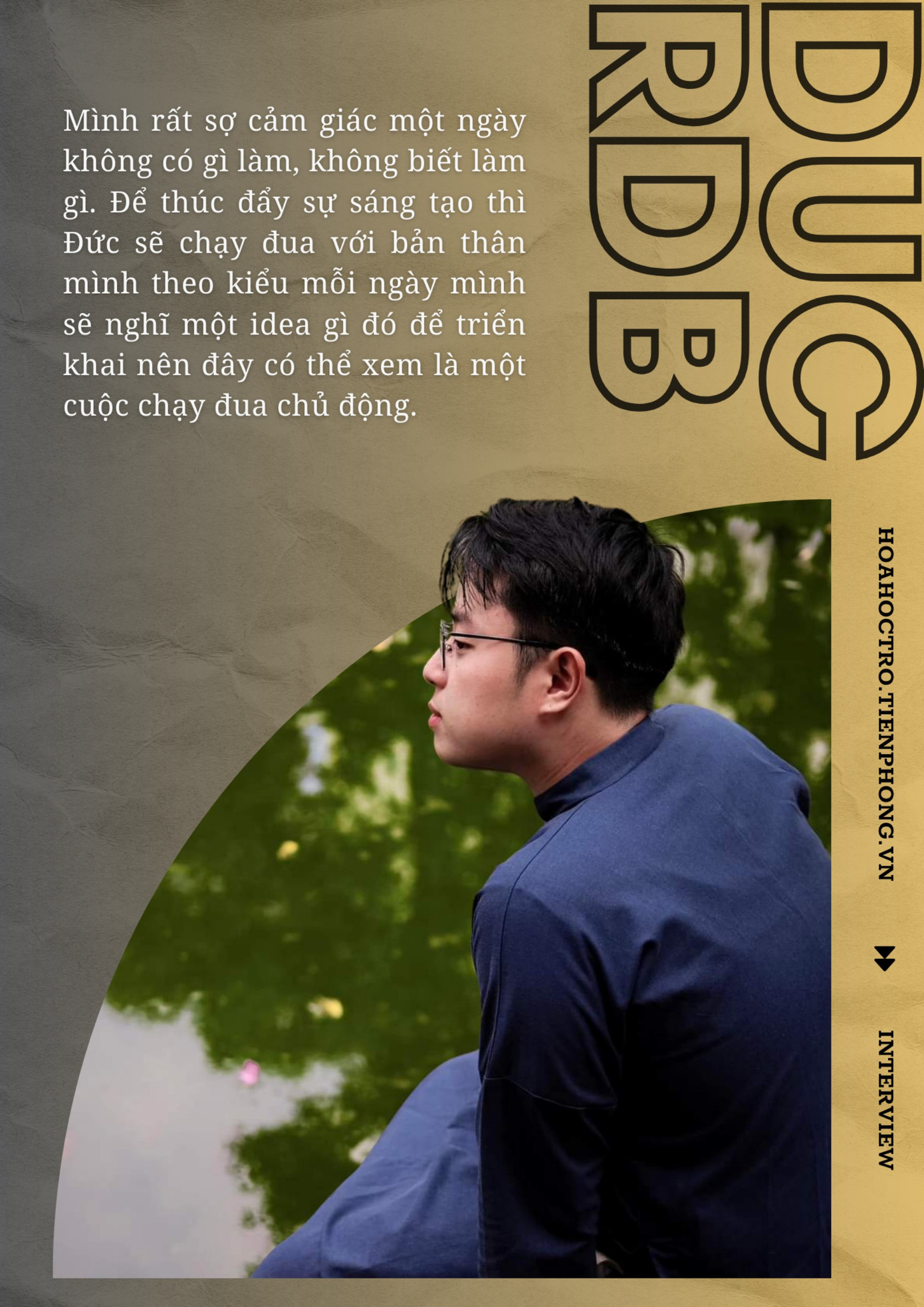 Để mà chạy đua thì Đức nghĩ đây là cuộc chạy đua với bản thân. Mình rất sợ cảm giác một ngày không có gì làm, không biết làm gì. Để thúc đẩy sự sáng tạo thì Đức sẽ chạy đua với bản thân mình theo kiểu mỗi ngày mình sẽ nghĩ một idea gì đó để triển khai nên đây có thể xem là một cuộc chạy đua chủ động.