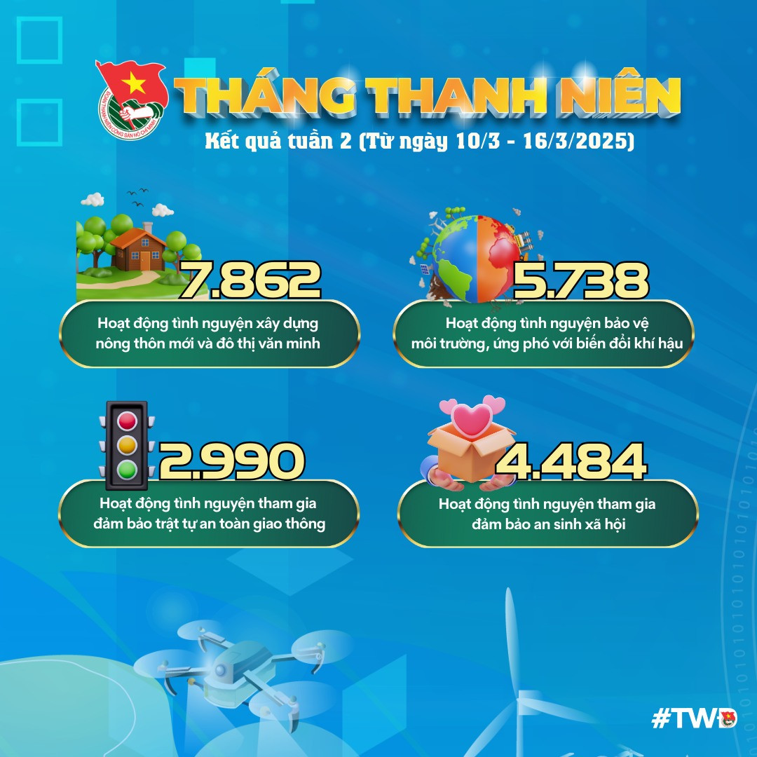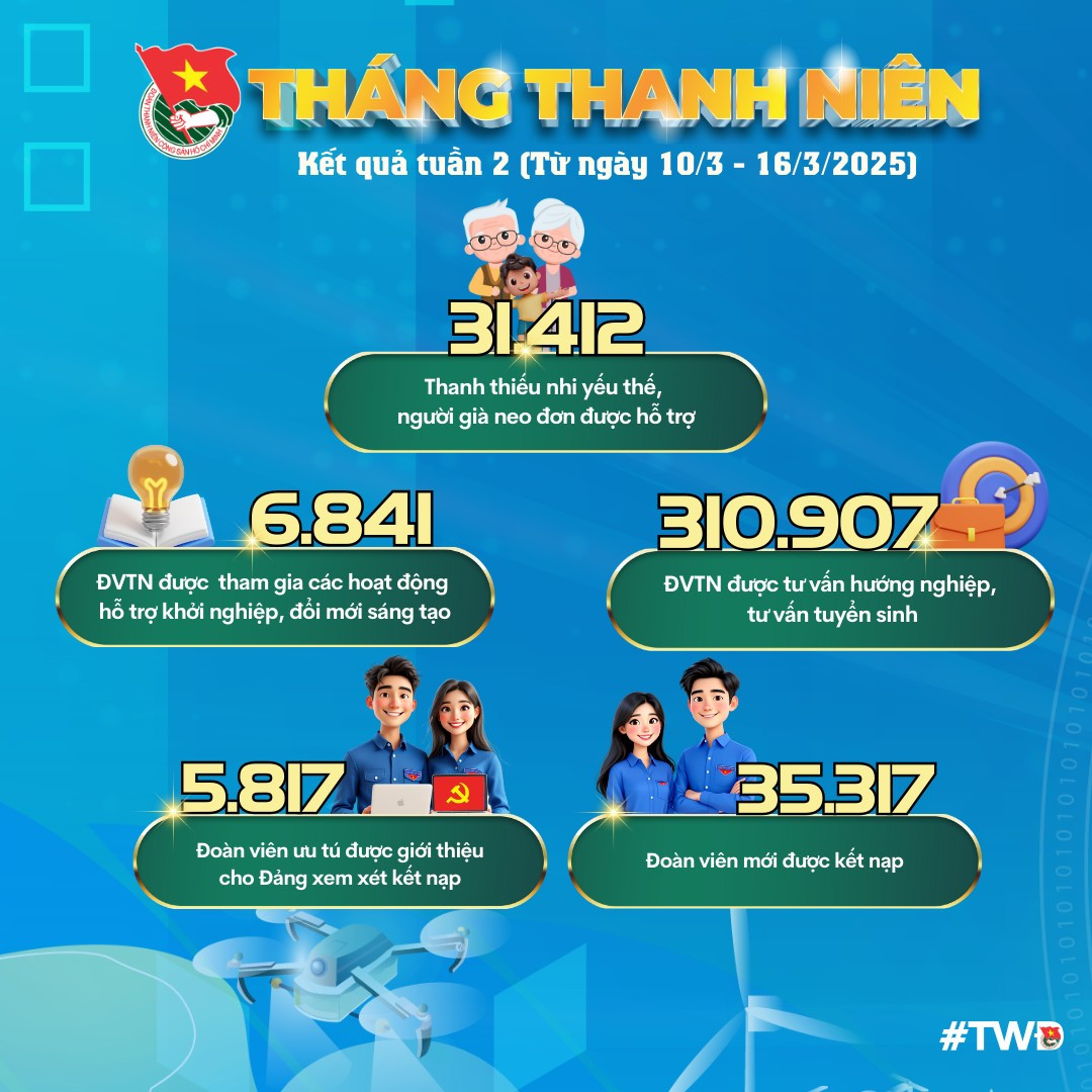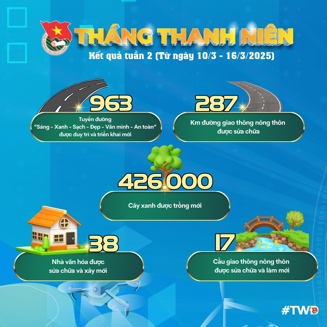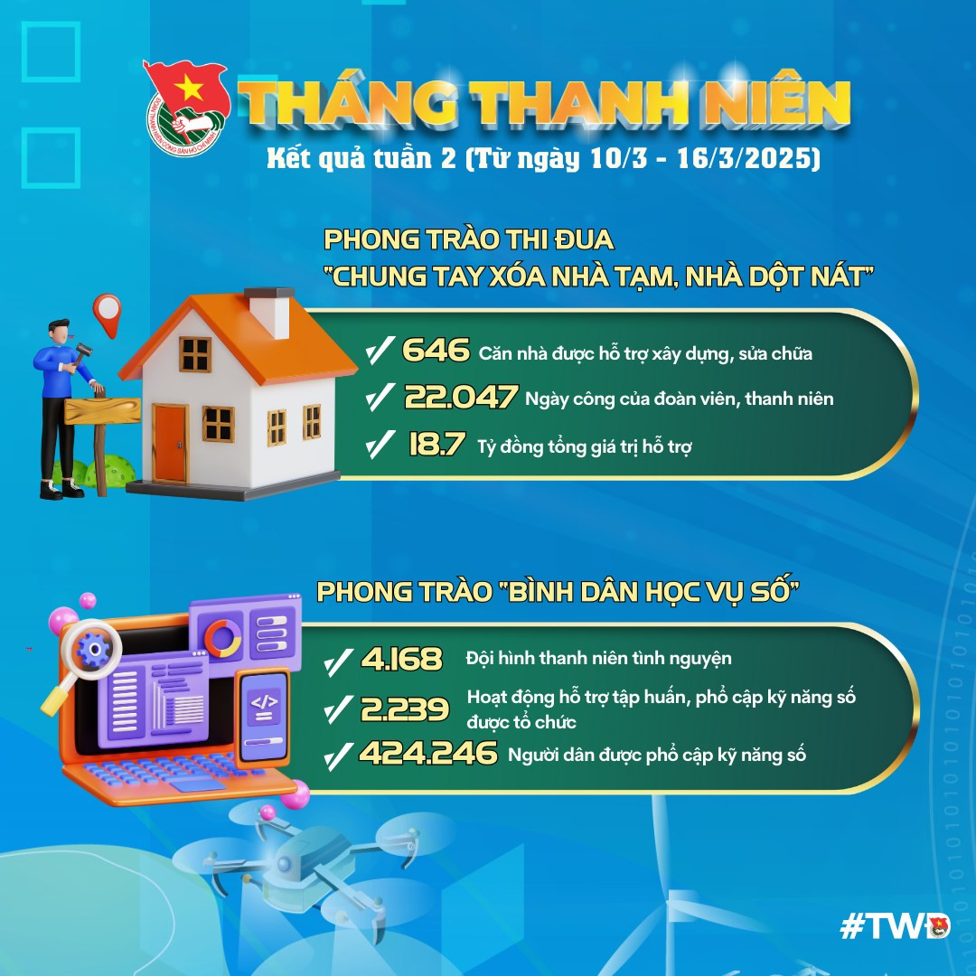 SVO - Chỉ sau hai tuần triển khai, Tháng Thanh niên 2025 đã ghi nhận hàng loạt kết quả bứt phá: Hơn 420.000 người dân được phổ cập kỹ năng số, gần 650 căn nhà được sửa chữa và xây mới, hàng nghìn công trình thanh niên được thực hiện. Đặc biệt, nhiều chỉ tiêu đã chạm mốc 70 - 100% kế hoạch, khẳng định tinh thần xung kích và cống hiến không ngừng của tuổi trẻ Việt Nam