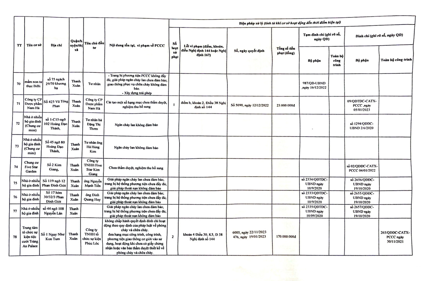 | Danh sách các công trình chưa nghiệm thu PCCC đã đưa vào hoạt động tại quận Thanh Xuân |