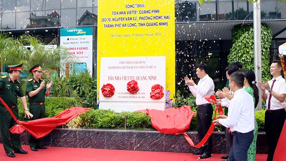Gắn biển chào mừng Đại hội Đảng bộ tỉnh lần thứ XV cho công trình Tòa nhà Viettel Quảng Ninh (tháng 9/2020).
