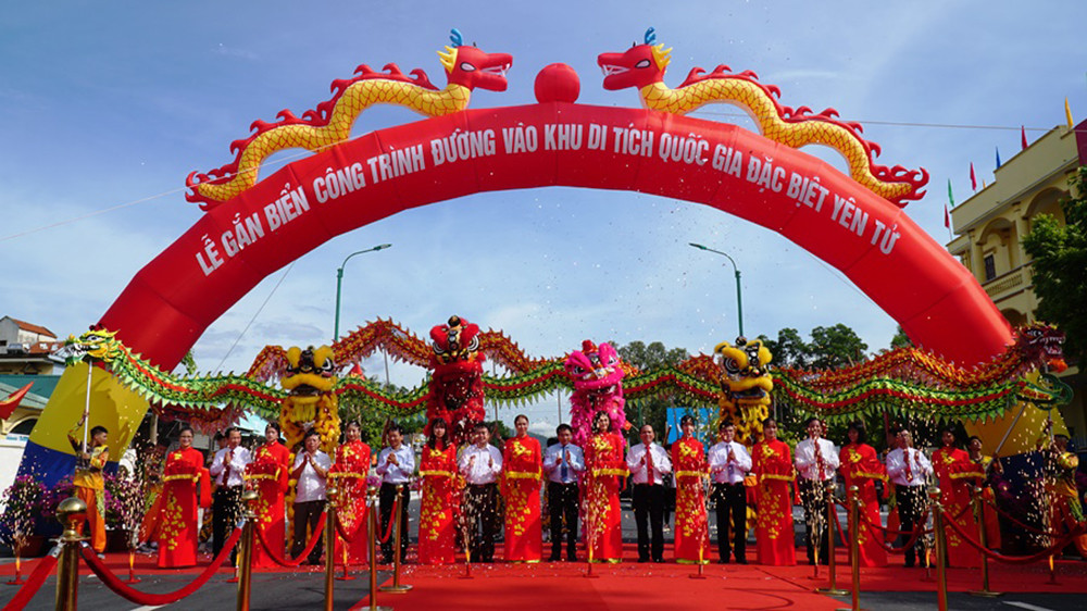 Các đại biểu cắt băng khánh thành, gắn biển công trình Đường vào Khu di tích Quốc gia đặc biệt Yên Tử (tháng 9/2020).