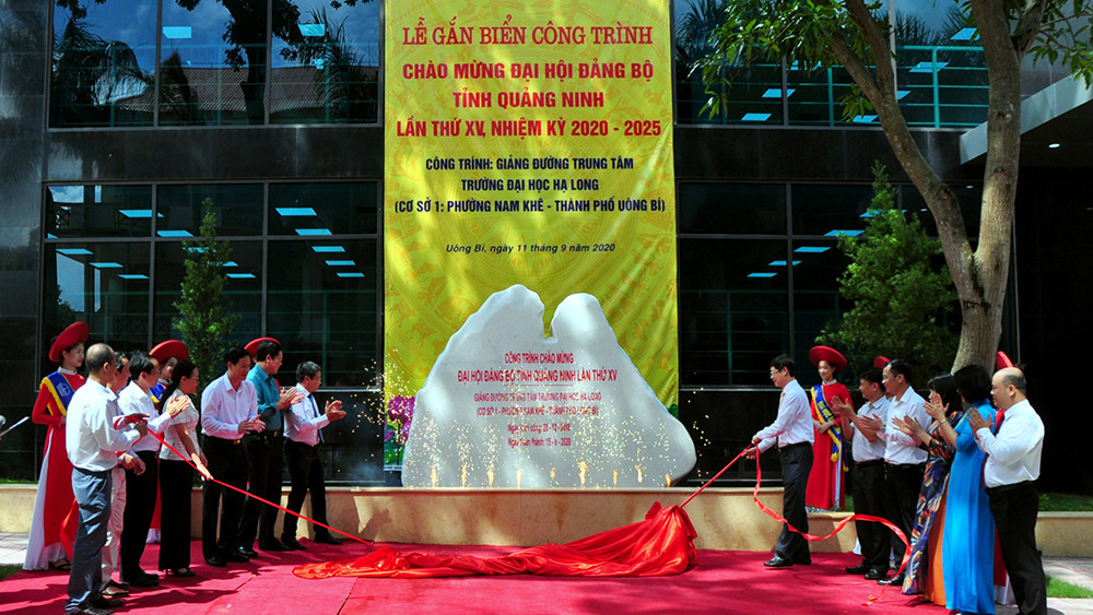 Gắn biển chào mừng Đại hội Đảng bộ tỉnh cho công trình Giảng đường trung tâm Đại học Hạ Long (tháng 9/2020).