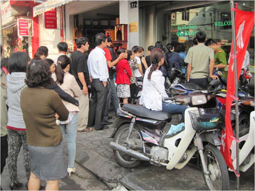 Khoảng 10 giờ, chúng tôi có mặt tại Trung tâm kim hoàn PNJ trên đường Nguyễn Văn Trỗi, Q.Phú Nhuận, TP.HCM, người dân cũng xếp hàng dài chờ mua vàng. Tầng hầm để xe của trung tâm không đủ chỗ cho khách nên xe "tràn" cả lên vỉa hè. Dạo qua các cửa hàng kinh doanh vàng tư nhân ở khu vực chợ Bà Chiểu (Q.Bình Thạnh), chợ Bến Thành (Q.1)... người dân đến mua vàng đông hơn ngày thường gấp nhiều lần. Hệ thống cửa hàng vàng bạc đá quý Mi Hồng (khu vực quanh chợ Bà Chiểu) cũng rơi vào tình trạng nhiều người chen lấn quanh tủ bán vàng nhẫn. Để tránh quá tải, nhân viên bán hàng in sẵn phiếu cùng giá tiền đối với từng loại sản phẩm, khi khách yêu cầu mua loại nào là đưa ra ngay mà không phải mất thời gian tính toán.